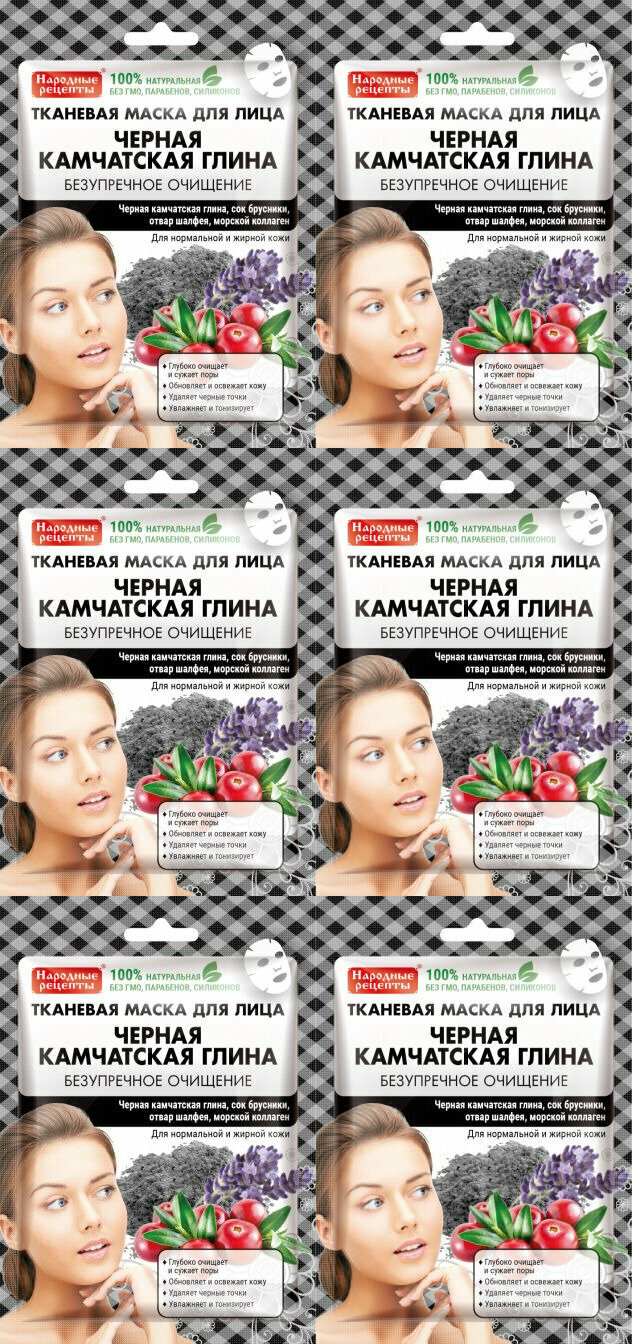 Fito Косметик Маска для лица Тканевая Черная камчатская глина "Народные Рецепты " 25мл, 6 штСовременная натуральная тканевая маска на основе черной камчатской глины безупречно очищает, обновляет и освежает кожу. Черная глина глубоко очищает, сужает поры и матирует кожу, морской коллаген превосходно увлажняет, разглаживает морщинки и омолаживает, сок брусники устраняет черные точки и воспаления, отвар шалфея успокаивает и тонизирует.