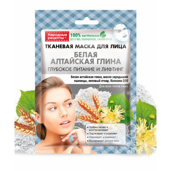 Тканевая маска для лица Народные рецепты - современная натуральная маска на основе алтайской белой глины с коэнзимом Q10. Состав обладает мощным лифтинг эффектом, моделирует овал лица, глубоко питает и смягчает кожу.