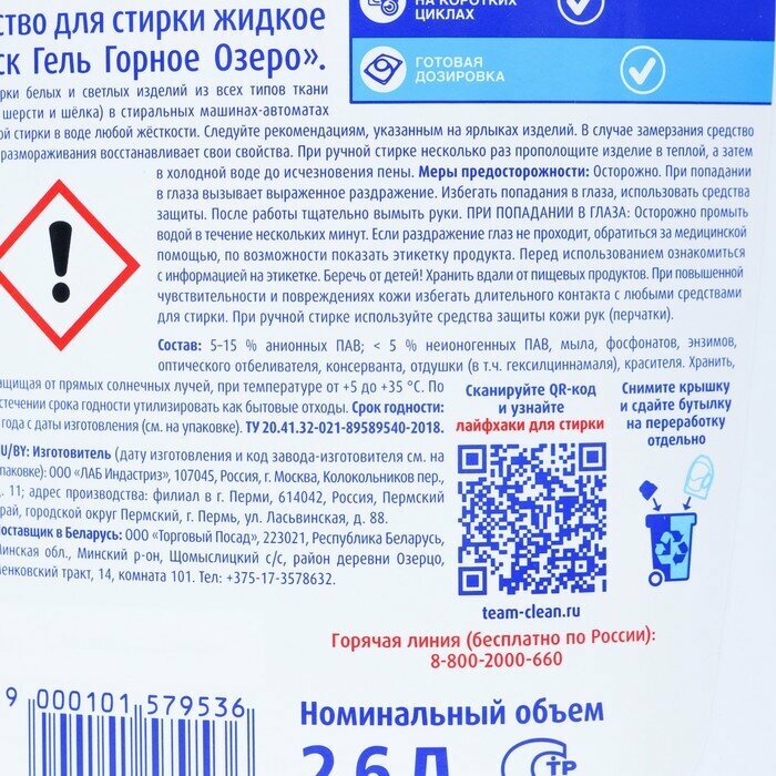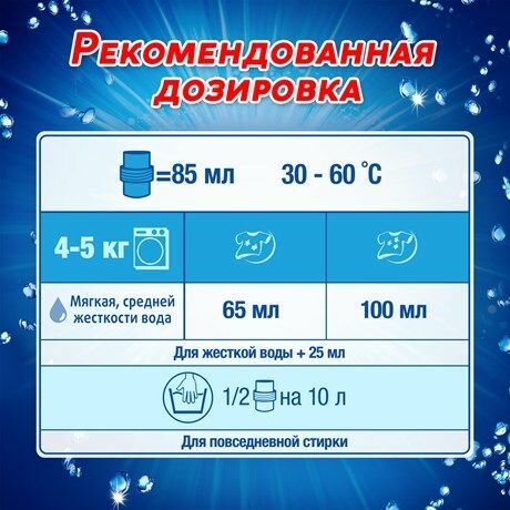 | Меры предосторожности | Беречь от детей. Хранить вдали от пищевых продуктов. При попадании в глаза немедленно промыть проточной водой. При повышенной чувствительности и повреждениях кожи избегать длительного контакта с любыми средствами для стирки. |
