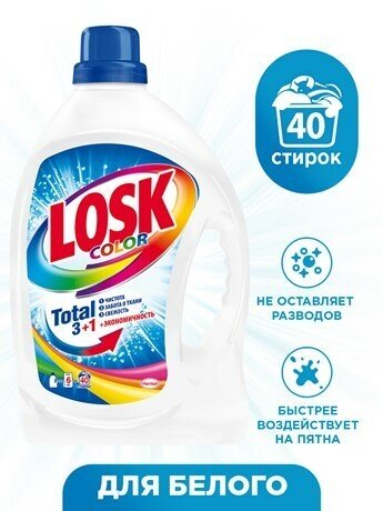 Гель для стирки LOSK Color. Cохраняет яркость цветного белья. Справляется с различными видами пятен. Дарит вещам свежий аромат. Подходит для всех типов тканей, кроме шерсти и шелка. Обеспечивают щадящее отношение к ткани во время стирки. Растворяется даже в холодной воде и при стирке на коротких циклах. Не оставляет разводов и полностью выполаскивается водой. Не пылит, не просыпается и не накапливается в кювете стиральной машины.