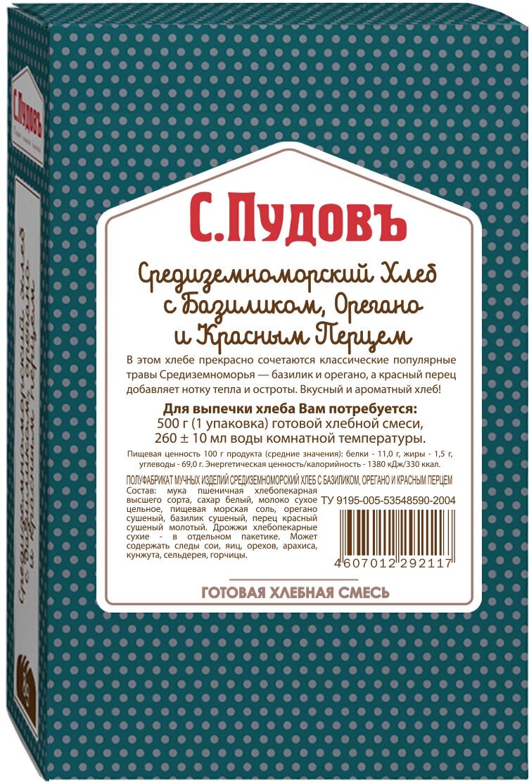 Сервис сравнения цен СкидкаГИД предлагает сравнить цены на товар «Смесь для выпечки С.Пудовъ Средиземноморский хлеб с базиликом орегано и красным перцем 500г»