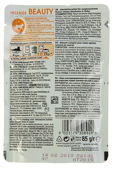 | Рекомендации | Проследите, чтобы у вашей кошки всегда была свежая вода! Возможны 2 варианты кормления: 100% влажного корма смешанное кормление: 1 пакетик влажного корма Intense Beauty и сухой корм (г) Вес кошки Только влажный корм ИЛИ Смешанное кормление пакетиков 1 пакетик + грамм сухого корма 3 кг 2 + 1/4 22 г 4 кг 2 + 3/4 32 г 5 кг 3 + 1/4 40 г 6 кг 3 + 3/4 48 г * Ориентируйтесь на суточный рацион, указанный на упаковке продукта |