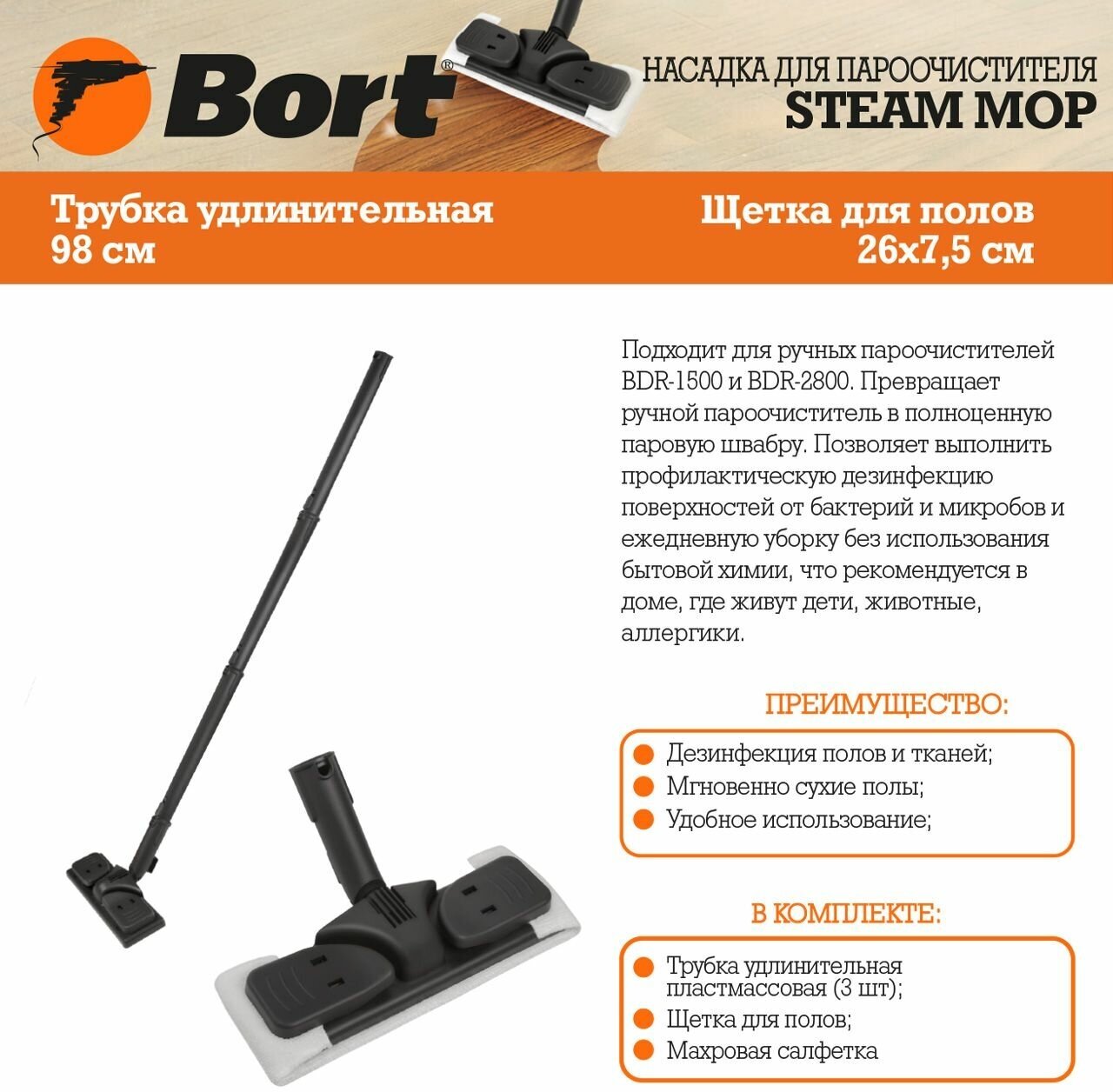 Насадка для пароочистителя Bort Благодаря данной насадке ручной пароочиститель превращается в полноценную паровую швабру. Насадка совместима с моделями: BDR-1500-RR и BDR2800-RR. В комплекте насадка для поли и 3 удлиннительные трубки.