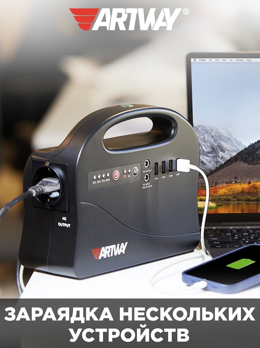 Портативный аккумулятор Artway PowerBank 39 600 mAh многофункциональное портативное зарядное устройство. Питает и заряжает ноутбуки, бытовую технику, освещение и другие приборы мощностью до 100 ватт. Благодаря лаконичному дизайну и продуманному форм-фактору внешний аккумулятор удобно брать с собой и всегда иметь при себе. Он не займет много места в рюкзаке или салоне авто. Благодаря розетке на 220 В, с помощью Artway PowerBank 39600 можно включить телевизор, лампу, холодильник, фен и другие бытовые приборы. В случае отсутствия питания или необходимости зарядки ваших устройств во время путешествия, вы можете подключить и пользоваться, а также зарядить свои электрические или цифровые устройства с помощью портативного блока питания Artway. В корпус зарядника вмонтирован яркий светодиодный фонарь. Фонарик может работать в нескольких режимах.