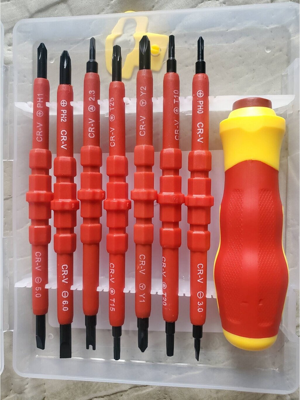 | Комплект поставки | рукоять отвертки, двухсторонний изолированный стержень 160 mm шлицы PH2-SL6, двухсторонний изолированный стержень 160 mm с шлицами PH1-SL5, двухсторонний изолированный стержень 160 mm с шлицами PH0-SL3, двухсторонний изолированный стержень 160 mm с шлицами Y1- Y2, двухсторонний изолированный стержень 160 mm с шлицами Т15- Т25, двухсторонний изолированный стержень 160 mm с шлицами Т10- Т20, двухсторонний изолированный стержень 160 mm с шлицами U10- Н20, пластиковый кейс |
