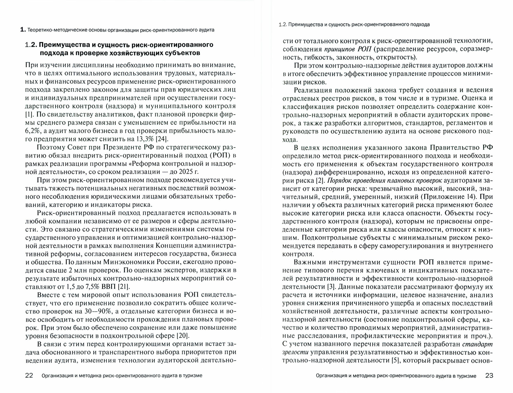 Раскрыты принципы риск-ориентированного подхода к проверке хозяйствующих субъектов, полномочия контрольно-надзорных органов в сфере туризма. Охарактеризованы особенности предпринимательской деятельности в туризме, их влияние на возникновение рисков и методику аудита. Сформулированы системные подходы к изучению и оценке предпринимательских рисков туристских организаций в процессе аудита. Даны методики риск-ориентированного аудита ключевых бизнес-процессов и функций туристских организаций в соответствии с международными стандартами туристской деятельности, аудита и риск-менеджмента. Внесены рекомендации по минимизации и предупреждению экономических, финансовых, правовых и административных рисков, обобщению и оформлению результатов аудита.