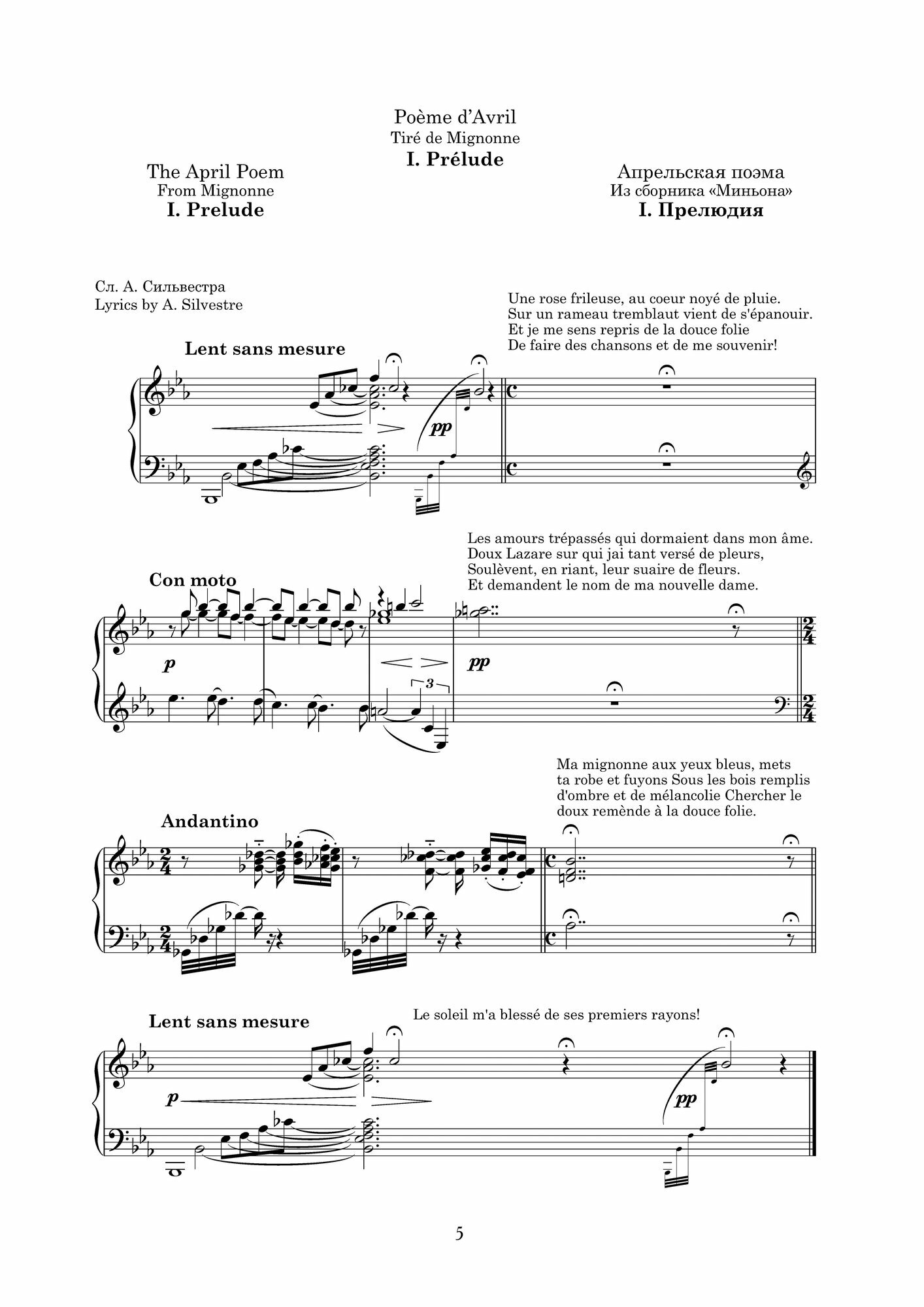 Перу французского композитора Ж. Массне (1842-1912) принадлежит около 200 романсов. Среди ранних камерно-вокальных сочинений особенно выделяется цикл романсов "Апрельская поэма" (1866) на слова А. Сильвестра, где проступают характерные черты стиля композитора – преобладание образов мечтательной любовной лирики. Подобные образы развиваются в вокальном цикле "Октябрьская поэма" (1871) на слова П. Коллена. Цикл "Зимняя поэма" (1882) также был написан на стихи Сильвестра. Его содержание во многом перекликается с "Апрельской поэмой".