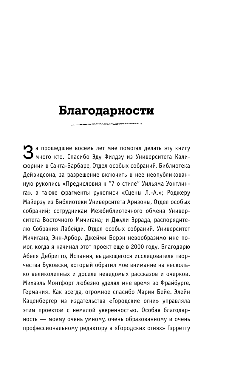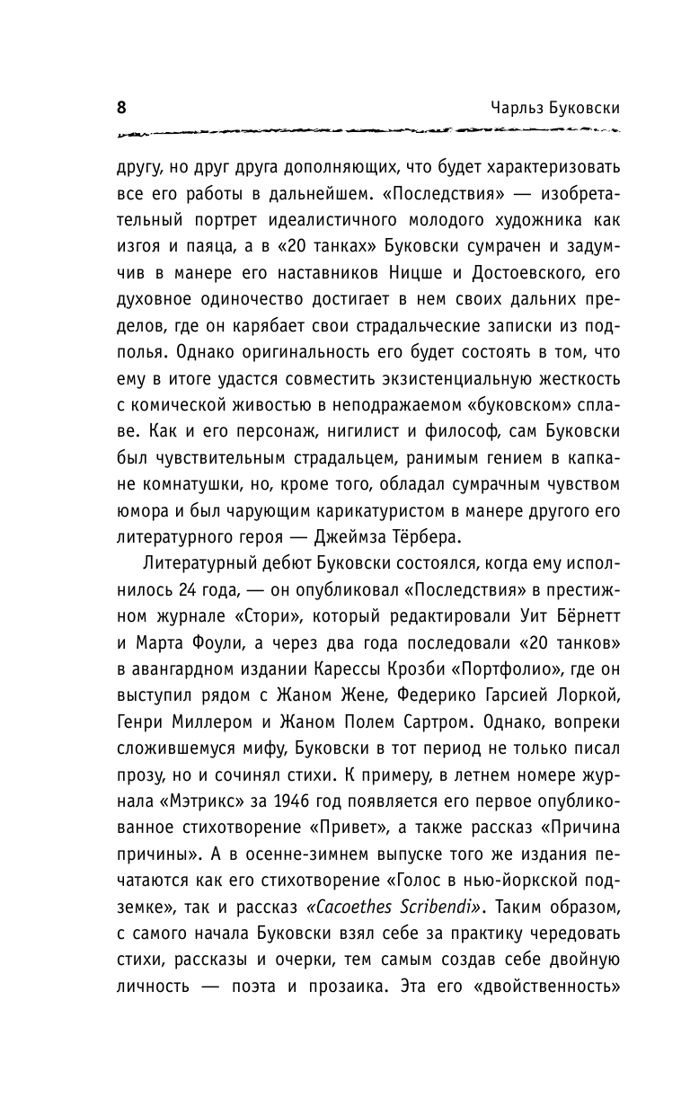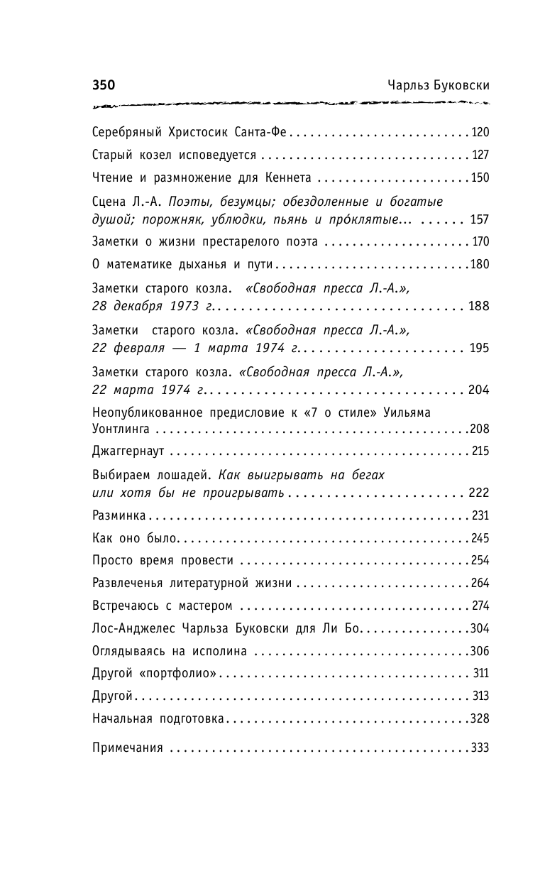 Очень хороший и приятный по составу сборник редкой малой прозы Буковски. Тут и разнообразные литературные (личные) манифесты, и просто рассуждения о литературе, о поэзии и поэтах. И, что главное у Буковски, о себе. Его тексты ценны автобиографичностью, т.е. редким вообще умением честно сказать о себе, без задних мыслей. И с юмором.