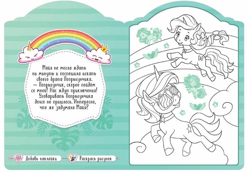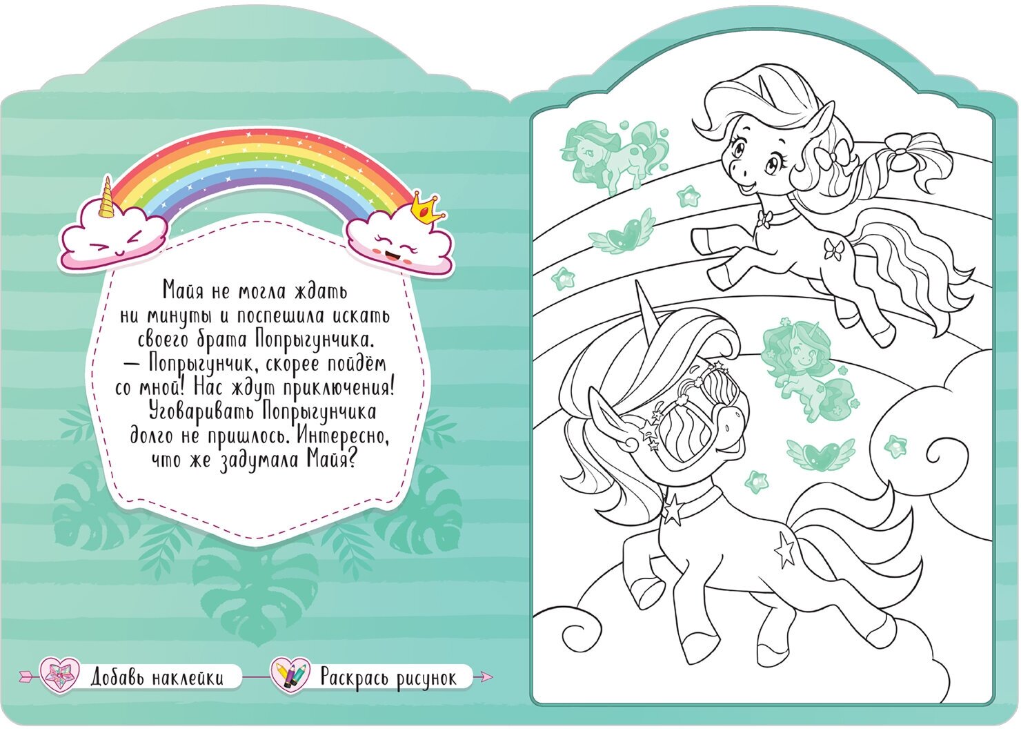 В книге вас ждет увлекательная сказочная история о приключениях очаровательных единорогов Майи и Попрыгунчика и 8 больших картинок, которые нужно раскрасить, а затем украсить наклейками. В конце книги художника ждет сюрприз – красочный диплом от Майи и ее друзей.