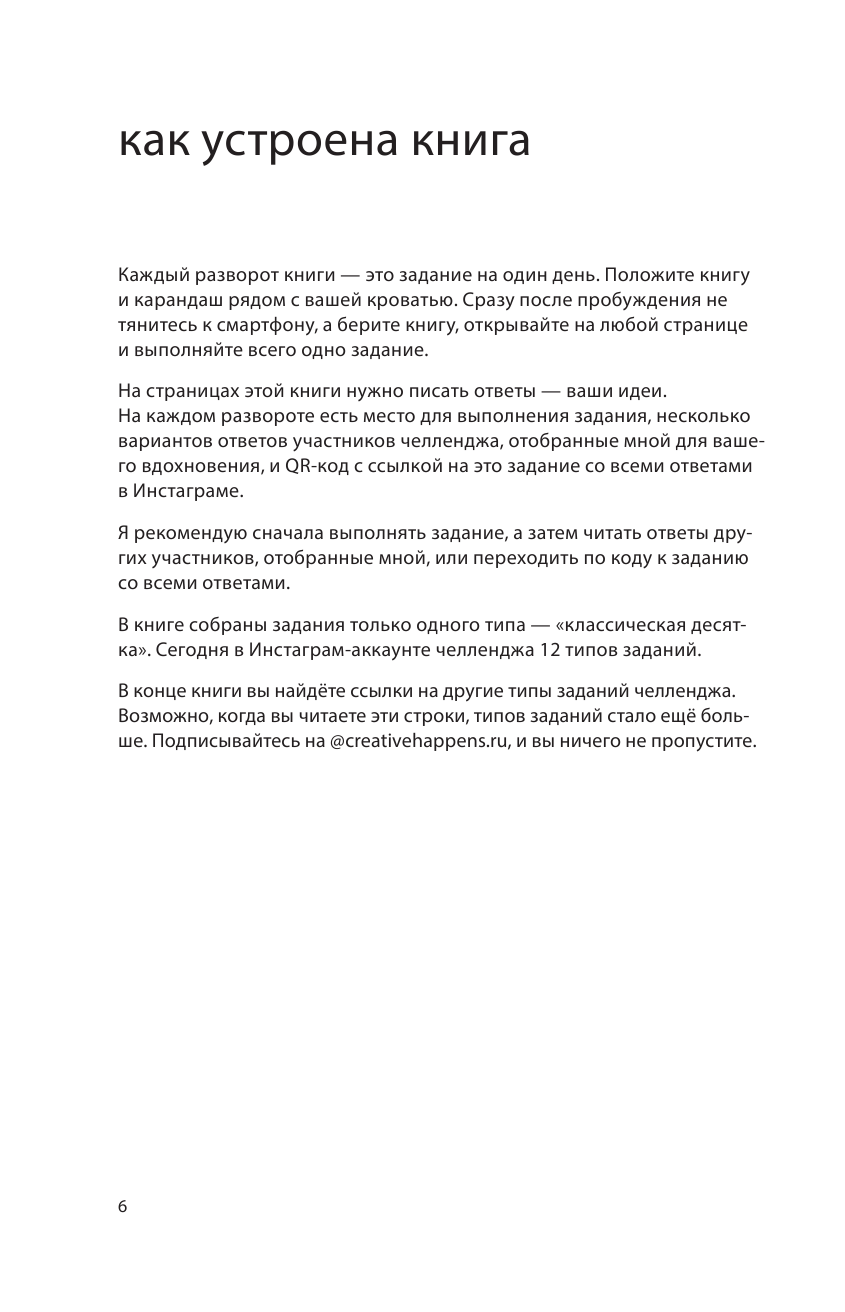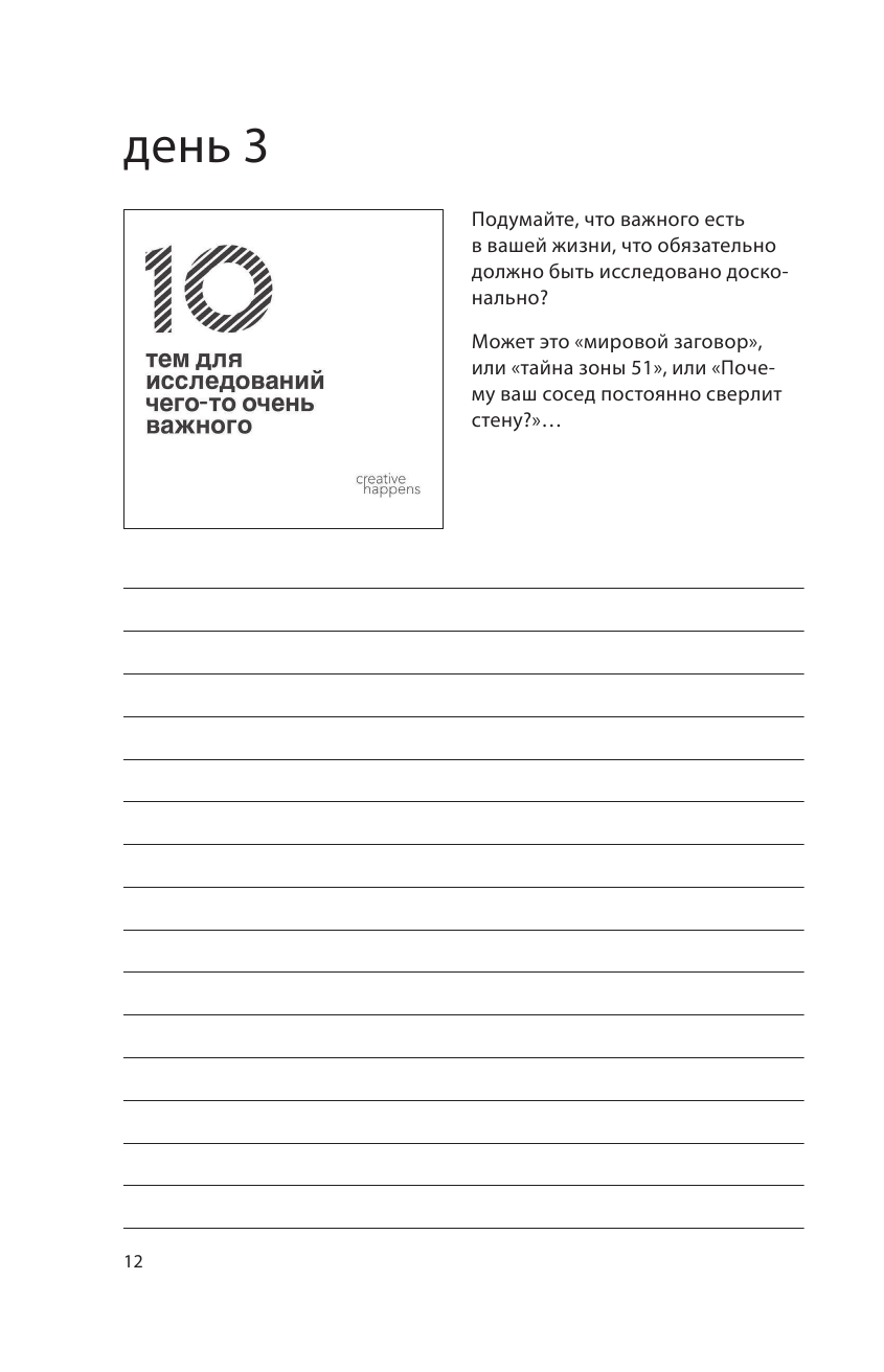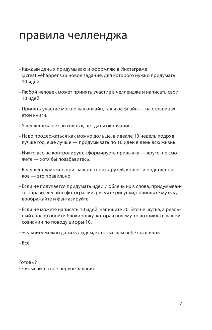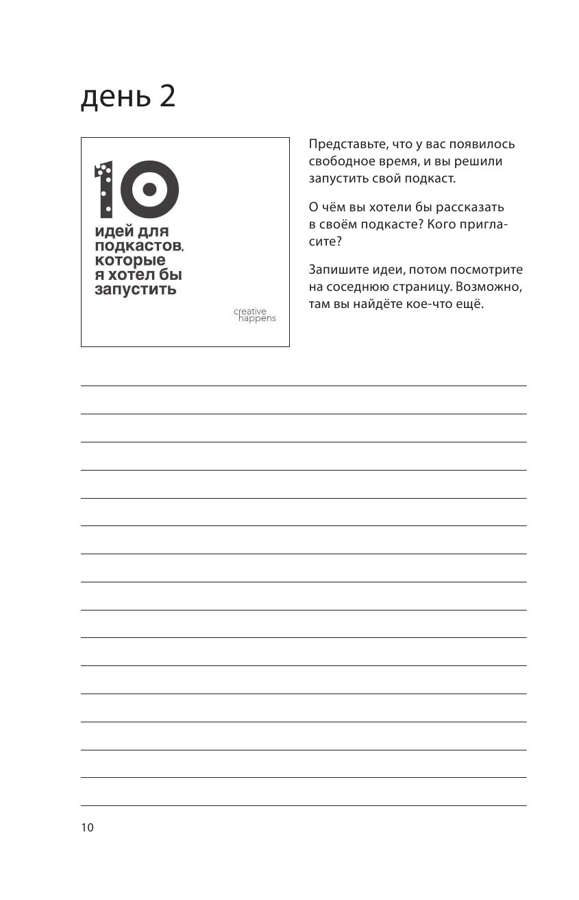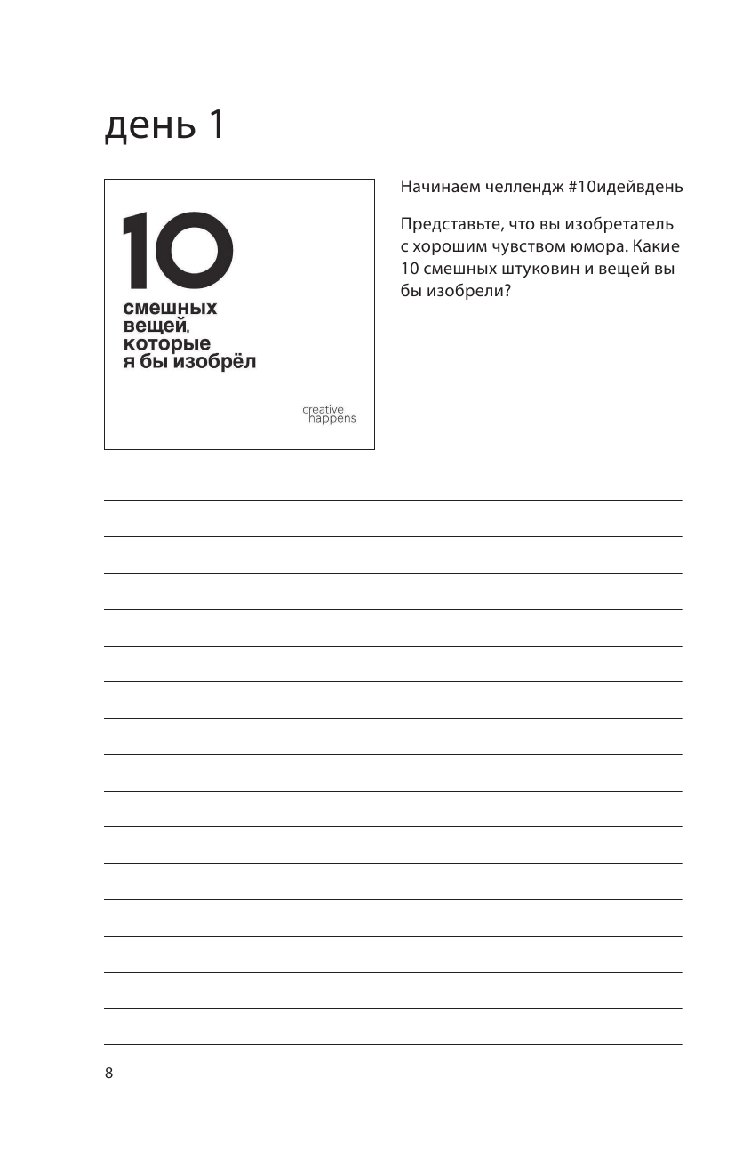 Ставила на этот блокнот, надеялась; что он поможет развить креативность. Дней 10 я его позаполняла и мой запал ушел. Да, задания прикольные и необычные, не повторяются, но иногда они не нравились мне. Возможно, автор хотел нас научить быть более веселыми в креативе. Вот например, придумайте 10 способов для улучшения работы почты России. Я думала, у меня были серьезные варианты. А автор предложил сжигать неврученные посылки на фестивале или письма в бутылочке. Какие-то пиксельные идеи, 10 вариантов использования вилки. В общем, придумывать нам предлогают разное и не всегда полезное
