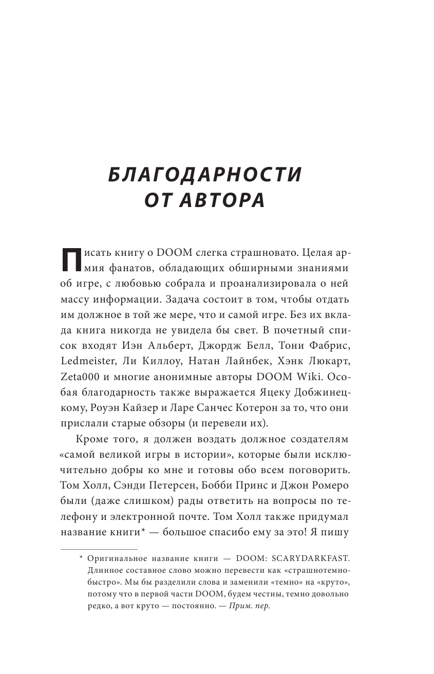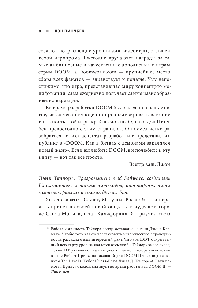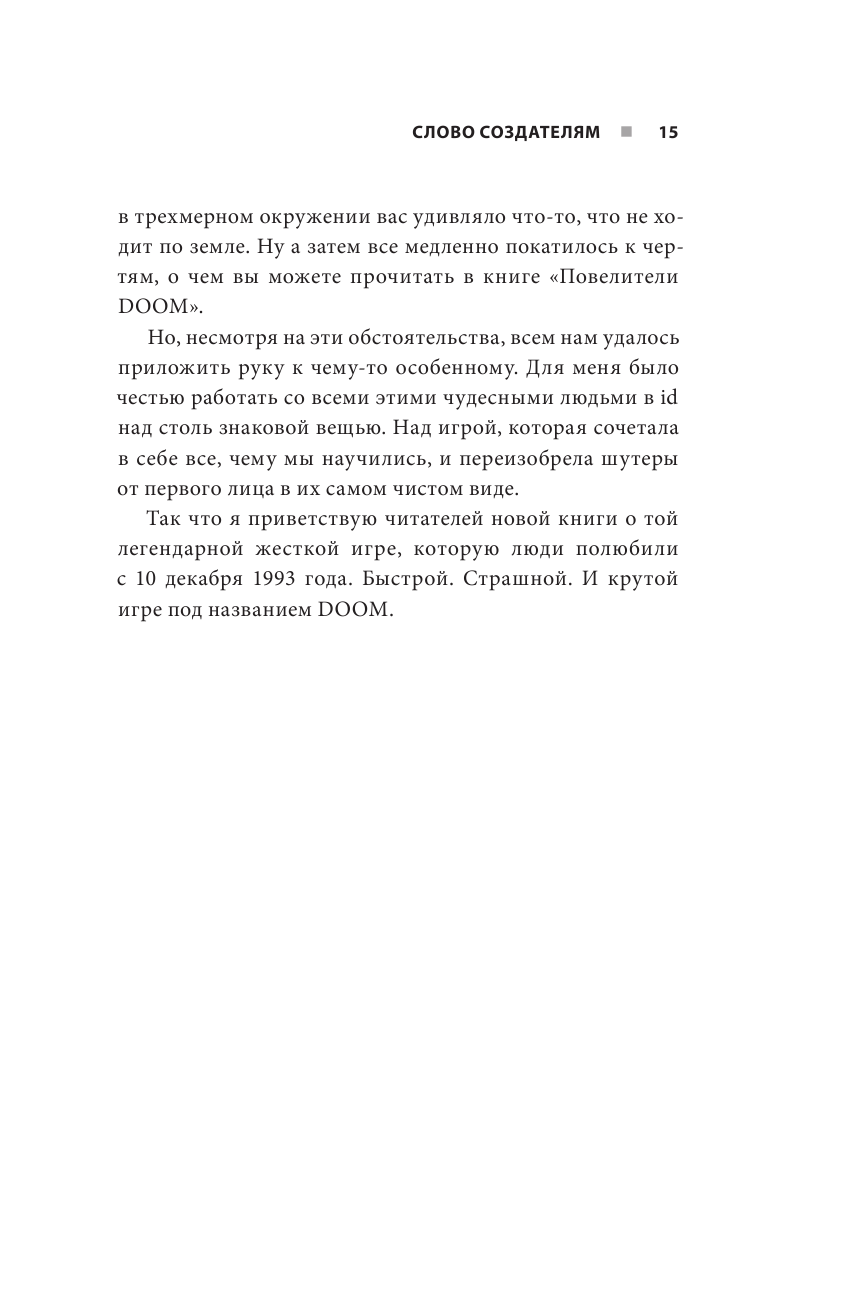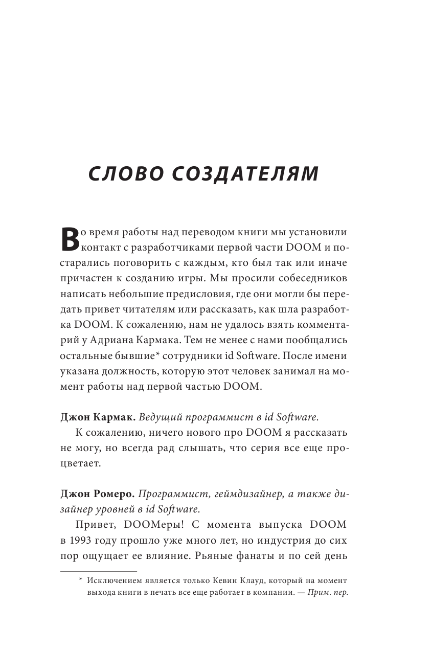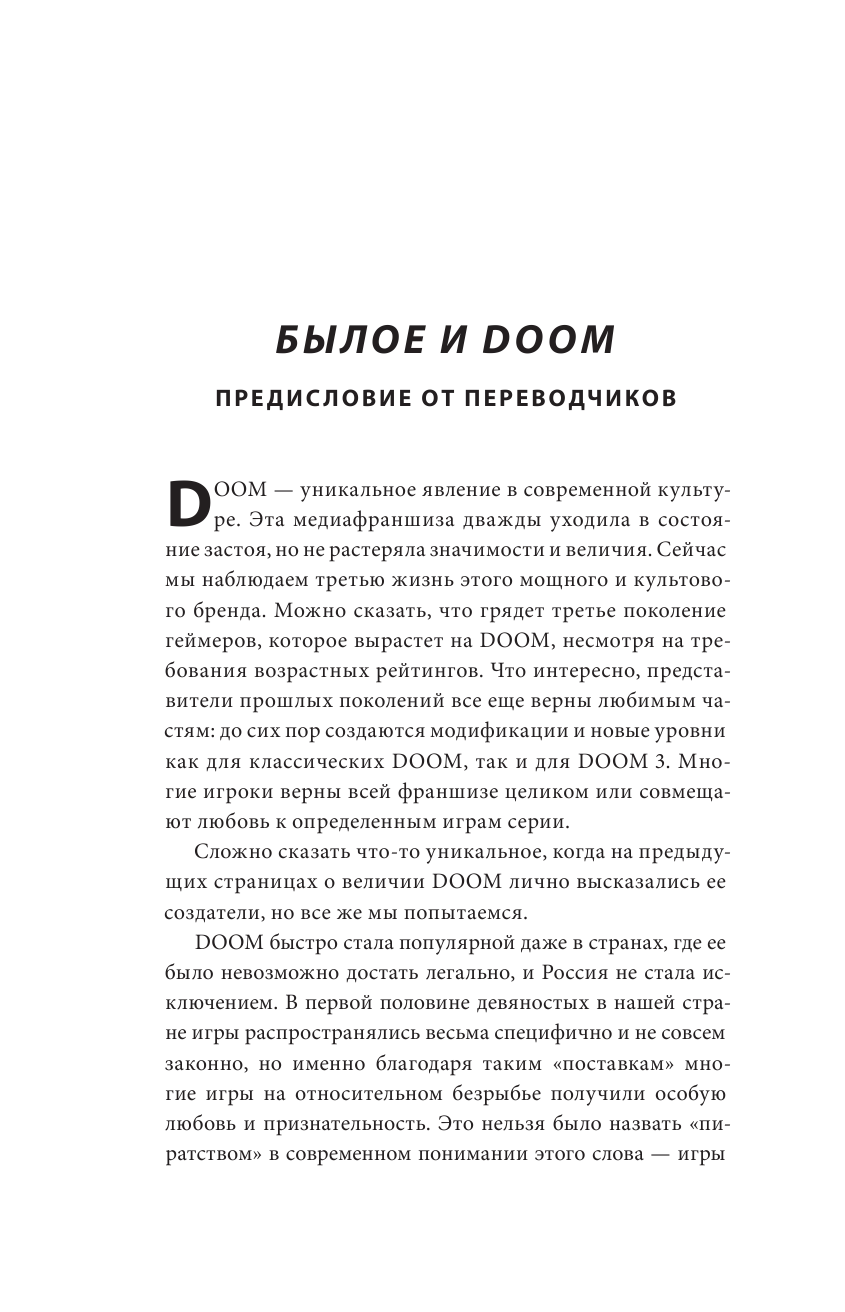 «Здорово, что подробный анализ DOOM выходит на русском языке! Учитывая, как в России любят DOOM, столь нужный перевод поможет пролить свет на уникальную в своем роде игру. Приятного чтения!» — Джон Ромеро, сооснователь id Software, программист, гейм- и левел-дизайнер Wolfenstein 3D, DOOM и других игр