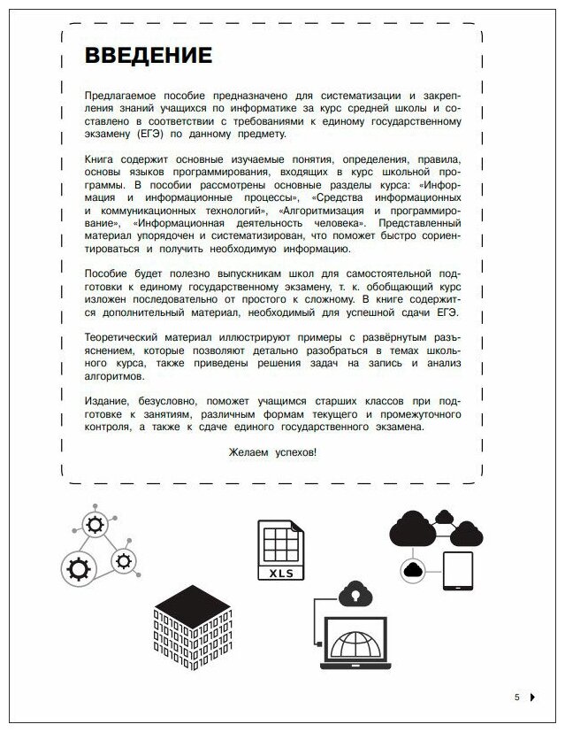 Отличная книга.Весь учебный материал изложен в понятной и доступной форме. Очень понравилось изучать информатику по схемам и таблицам приведённым в книге.Также понравилось то,что в книге есть примеры решения задач по информатике сразу на нескольких языках программирования.