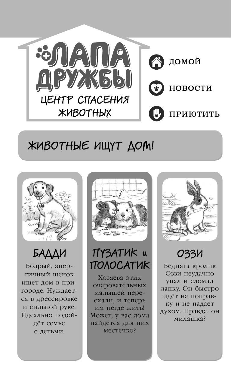 Книжка отличная во всех отношениях: интересный сюжет про центр спасения животных, белоснежная бумага, крупный шрифт, удобный формат, красивые рисунки графические, на обложке выпуклые буквы "Лапа дружбы" и выпуклая фигурка ежонка!