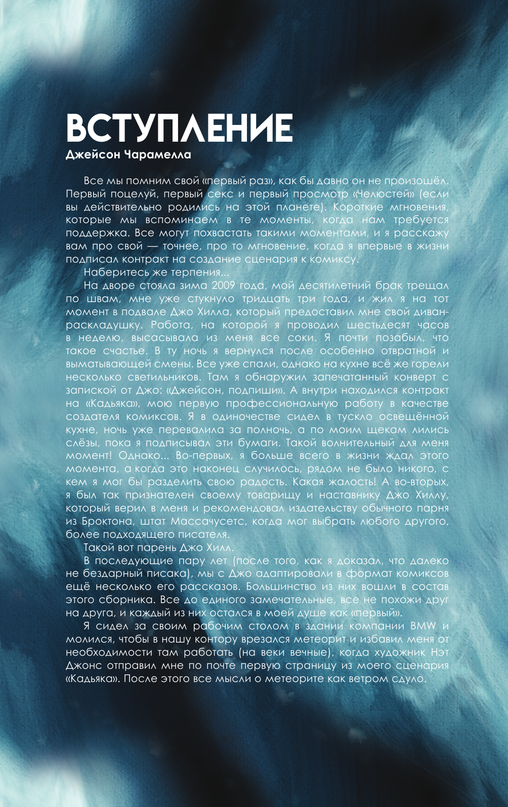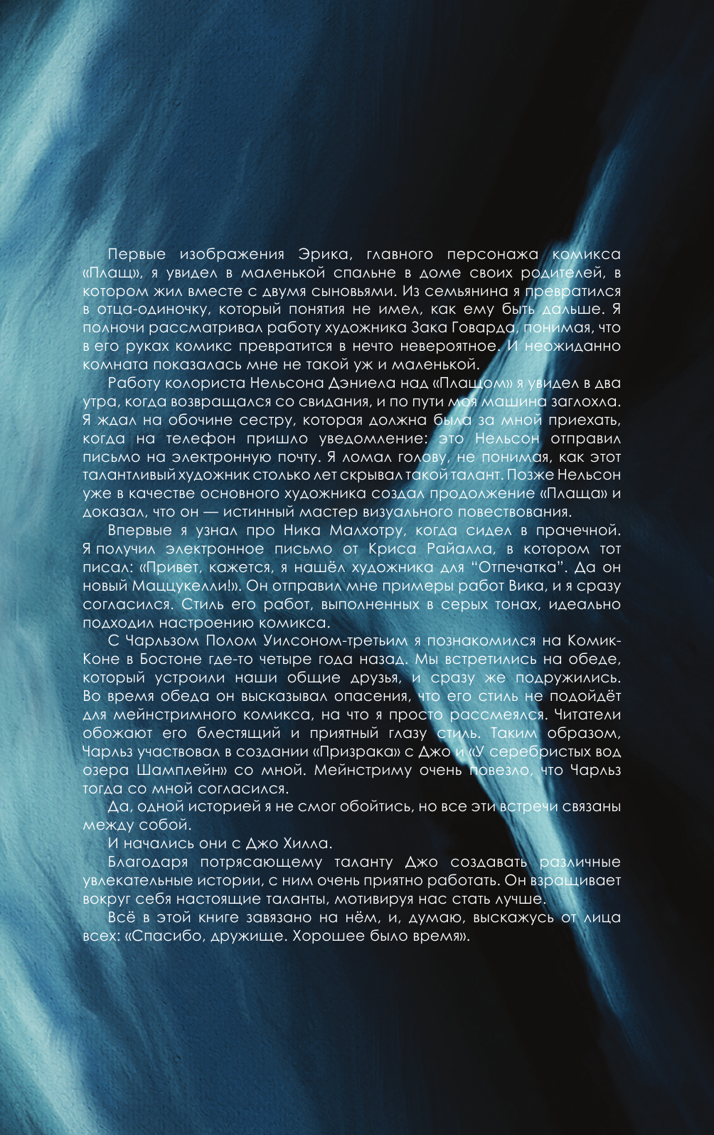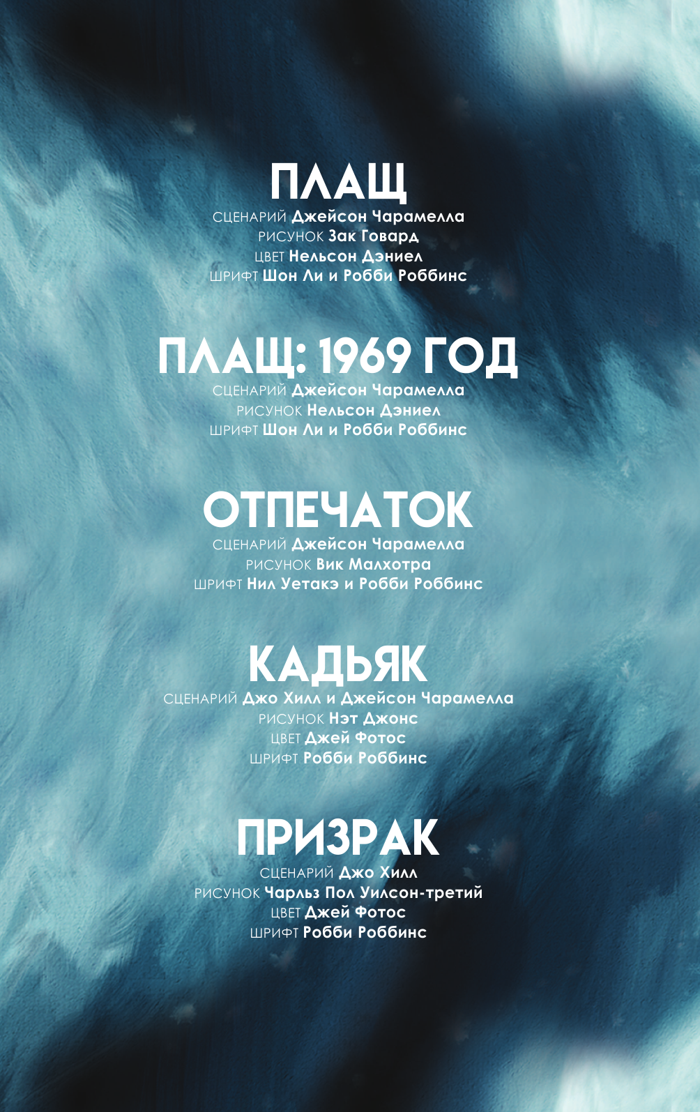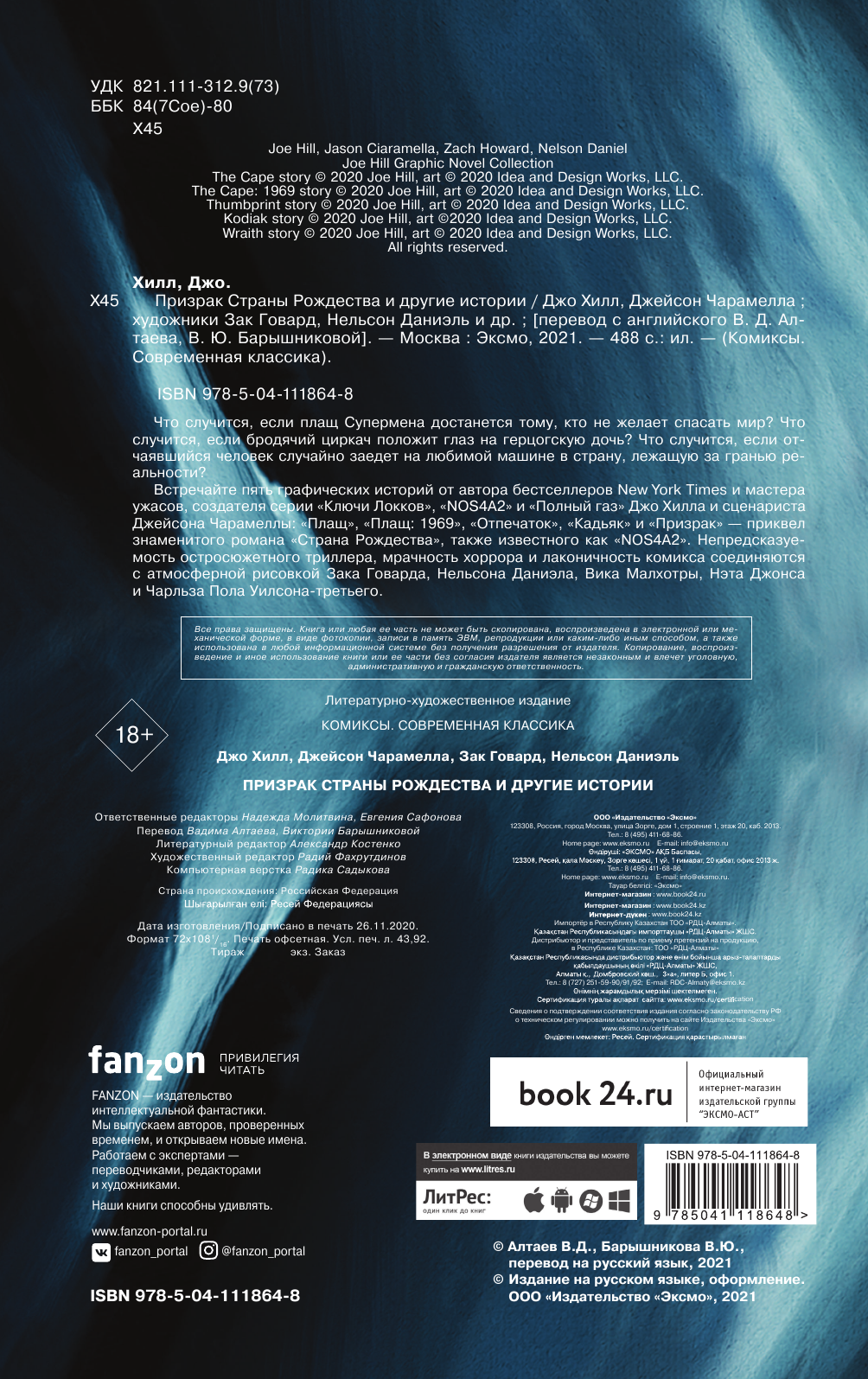 Что случится, если плащ Супермена достанется тому, кто не желает спасать мир? Что случится, если бродячий циркач положит глаз на герцогскую дочь? Что случится, если отчаявшийся человек случайно заедет на любимой машине в страну, лежащую за гранью реальности? Встречайте пять графических историй от автора бестселлеров New York Times и мастера ужасов, создателя серии "Ключи Локков", "NOS4A2" и "Полный газ" Джо Хилла и сценариста Джейсона Чарамеллы: "Плащ", "Плащ: 1969", "Отпечаток", "Кадьяк" и "Призрак" – приквел знаменитого романа "Страна Рождества", также известного как "NOS4A2". Непредсказуемость остросюжетного триллера, мрачность хоррора и лаконичность комикса соединяются с атмосферной рисовкой Зака Говарда, Нельсона Дэниела, Вика Малхотры, Нэта Джонса и Чарльза Пола Уилсона-третьего.