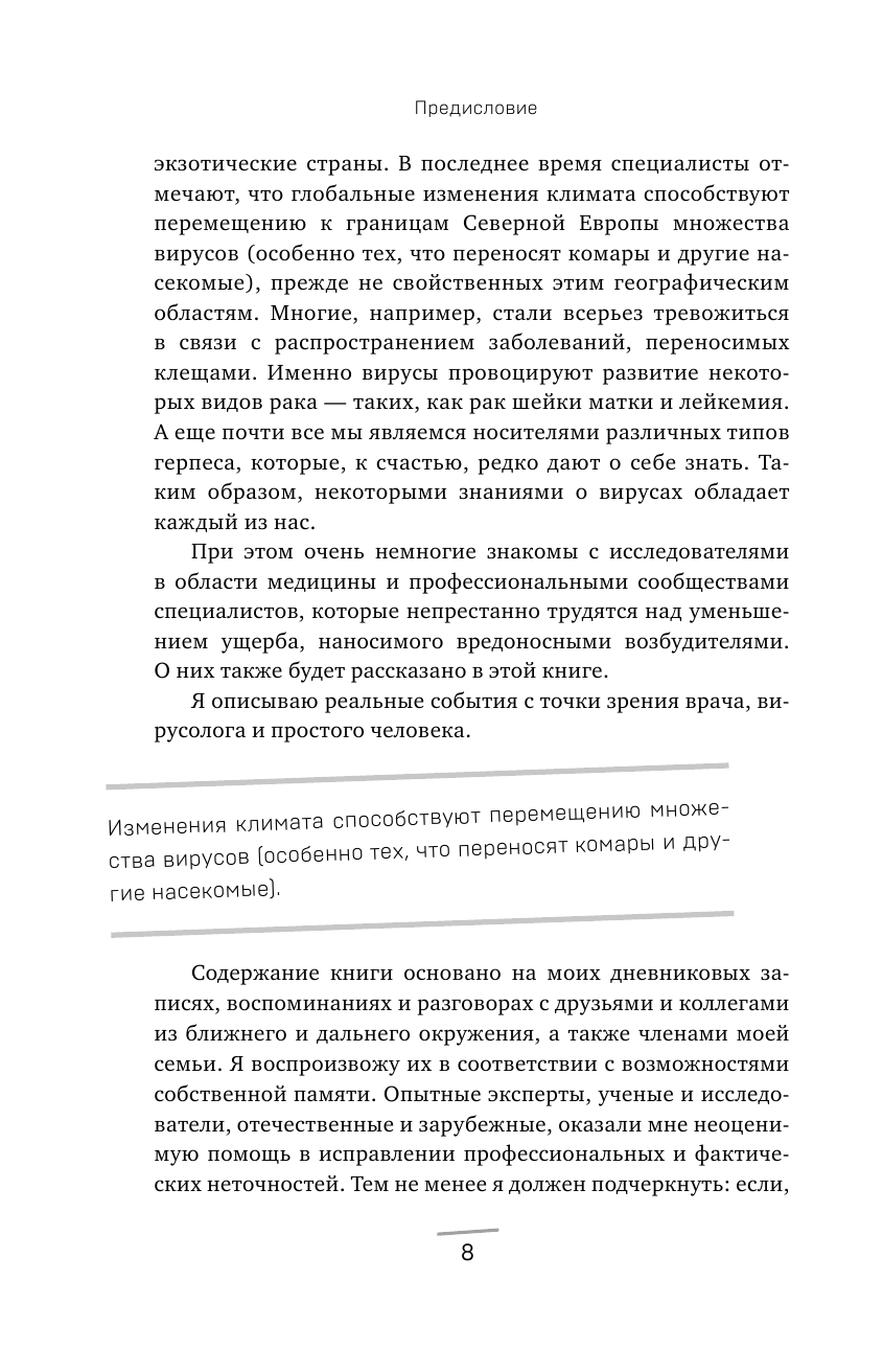 В книге известного датского врача в удивительно живой форме описан профессиональный путь самого автора, Андерса Фомсгорда, и результаты его многолетних наблюдений за вирусами. Неожиданные открытия вирусологов оказывают существенное влияние на общество, политику, а иногда приводят к настоящим детективным сюжетам.