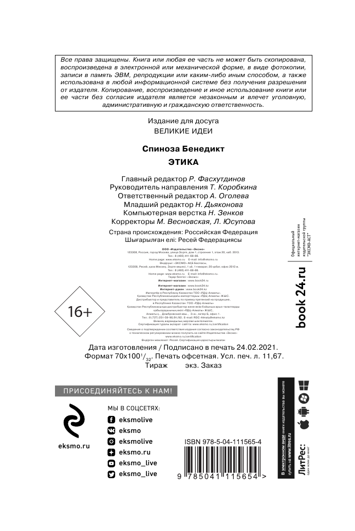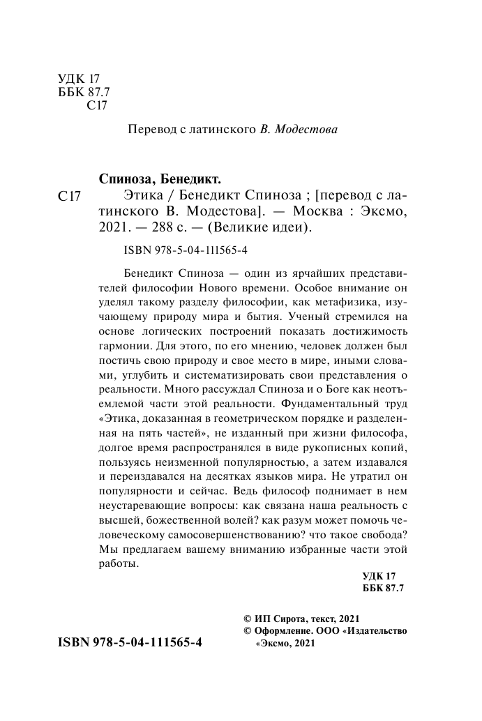 Книга: Этика (Бенедикт Спиноза); Эксмо, 2021