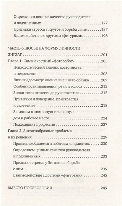 первый — вводный, а все остальные посвящены пяти типам психофигур. Все разделы даже однотипно называются — «Досье на форму личности Квадрат», Круг и так далее. Каждый раздел содержит две одинаково названные главы: «Самый честный «фоторобот»» и, например, «Зигзагообразные проблемы и их решения».