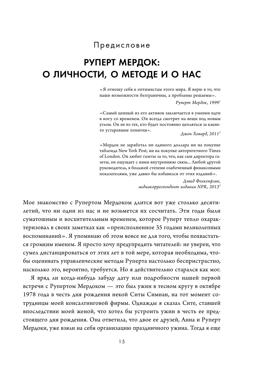 Эта книга, написанная финансовым консультантом, который проработал на Руперта Мёрдока 35 лет, — сборник управленческих приемов, лежащих в основе Метода Мёрдока. Она будет полезна лидерам, которые находятся в поисках компромисса между централизованным контролем и поощрением креативности, хотят создать великую компанию или ищут решение, если дело всей жизни подвергается угрозе.