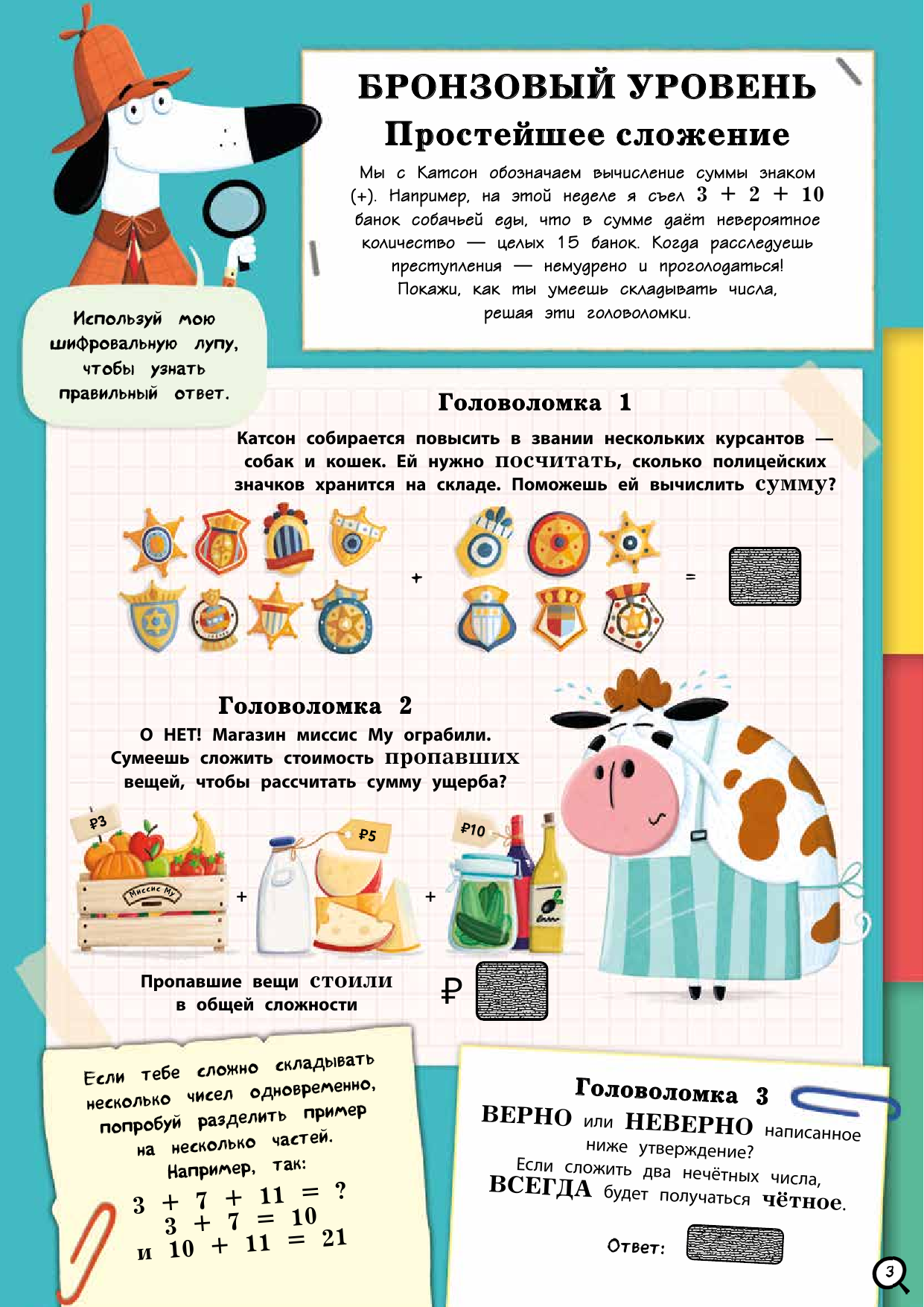 Это журнал м множеством матеметических примеров. Яркие иллюстрации, не большие и понятные задания увлекают ребенка. В копмлекте есть лупа, с помощью которой можно проверить ответ. Подойдет для детей, которые начали учить таблицу умножения и сложение вычетание двухзначных чисел. Отличный тренажер на лето, что бы не забыть математику.