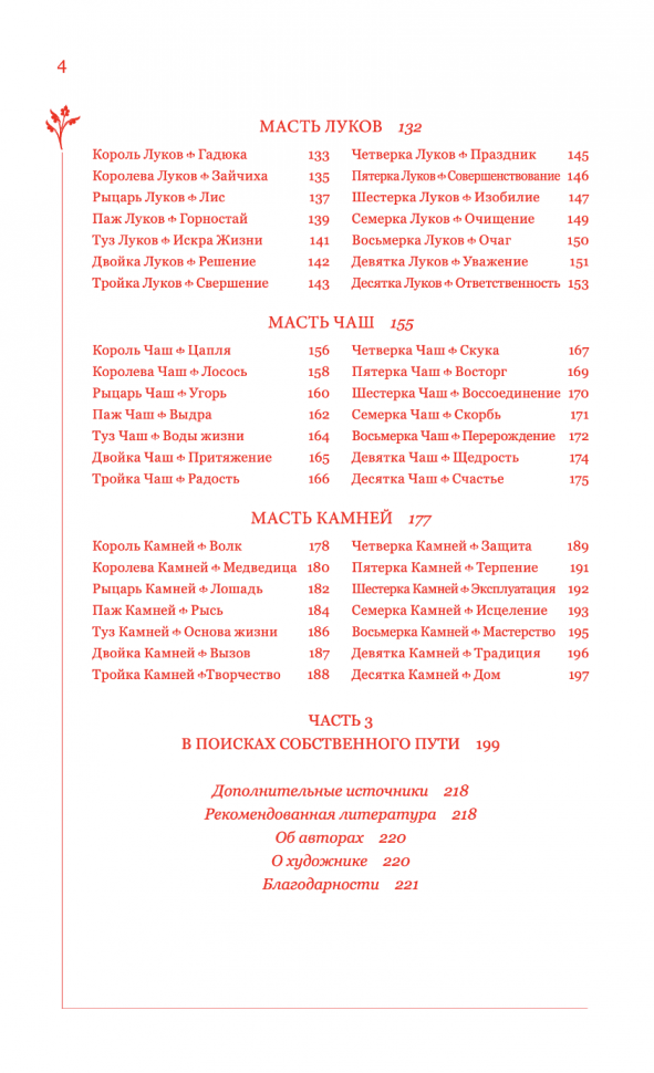 Младшие Арканы поменяли названия мастей, хотя частично напоминают о стандарте – Стрелы, Луки, Чаши, Камни. Сложнее всего, само собой с Луками и Стрелами, но понятно, что первое – Жезлы, второе Мечи. Двор до безумия стандартен – Король, Королева, Рыцарь и Паж. Двор представлен животными – Стрелы птицами, Луки – малыми животными, близкими к земле, Чаши водоплавающими, Камни – крупными млекопитающими. Радикально поменялся только финал масти Стрел. В остальном же – примерно 90 процентов Минорных Арканов не просто узнаваемы – просто копии с поправкой на тематику тех же РУС. Наиболее типичны в этом контексте Луки. Наименее – как я уже и отмечал, Стрелы.