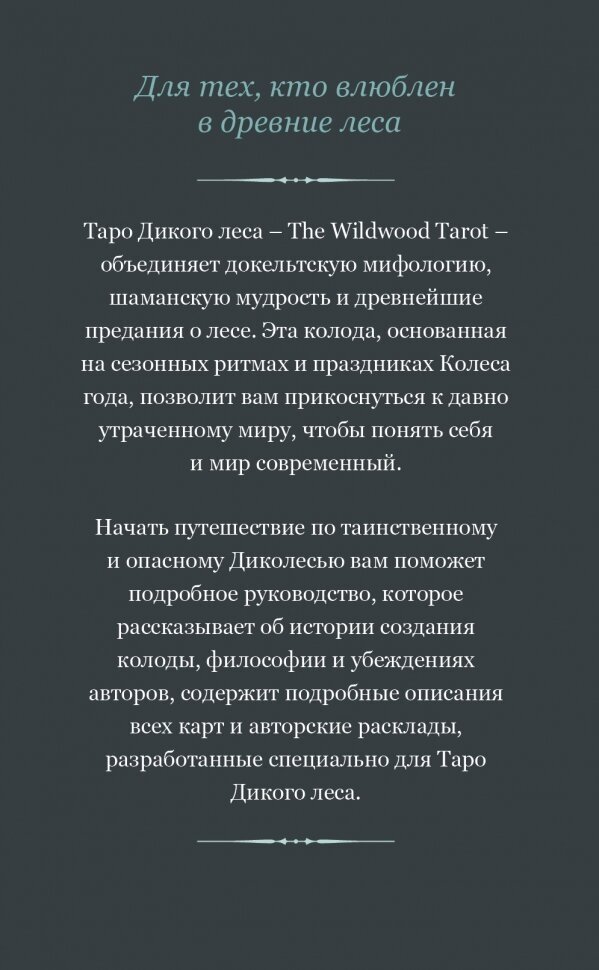 Таро Дикого Леса вышло в 2011-м году, его авторами являются Марк Райан и Джон Мэтьюс. Последнего хорошо знаем по потерянному Таро Нострадамуса, Стимпанку и Таро Священного Грааля. И это не весь список – автор очень плодовитый. В качестве художника выступил Уилл Вортингтон – помимо исследуемого пациента еще шесть колод, все в нарочито кельтостиле. Один из них – знакомый многим Друидкрафт, недавно локализованный Энигмой. Эклектик до сих пор отгружает твердую четверку трудам Райана и Мэтьюса.