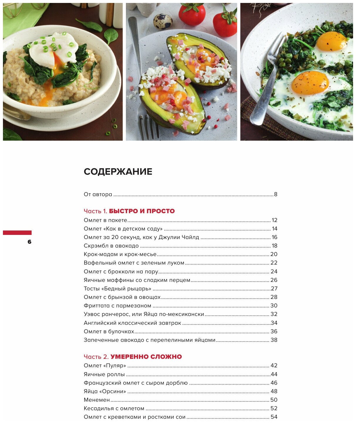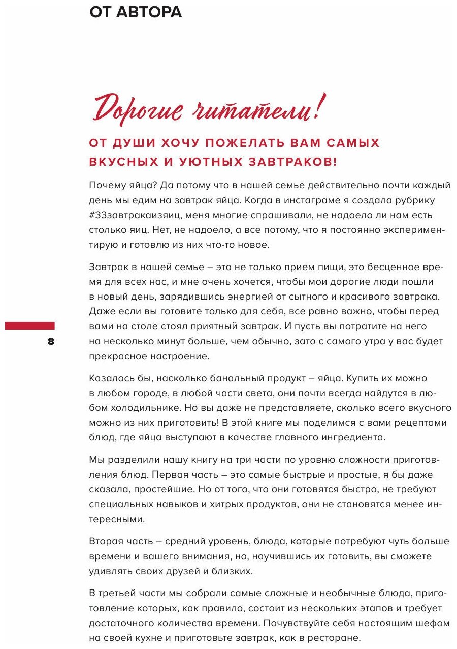 "Не только пашот. 50 завтраков из яиц" из кухонь разных стран. Я бы уточнила еще, что многие блюда можно готовить и на ужин и в выходные дни. Автор предлагает готовить по нарастанию сложности: сначала те рецепты, которые "Быстро и просто", потом "Умеренно сложно" и наконец "Приложим усилия". Книга очень четкая. Информативные вводные тексты к каждому рецепту, подробный состав продуктов, пошаговые инструкции, советы по замене или о нюансах приготовления. Отличные по качеству композиции и фокусу фотографии блюд. В начале каждой из частей указан ее состав со страницами, для более конкретной навигации, при том, что есть полное содержание в начале книги. Рекомендую.