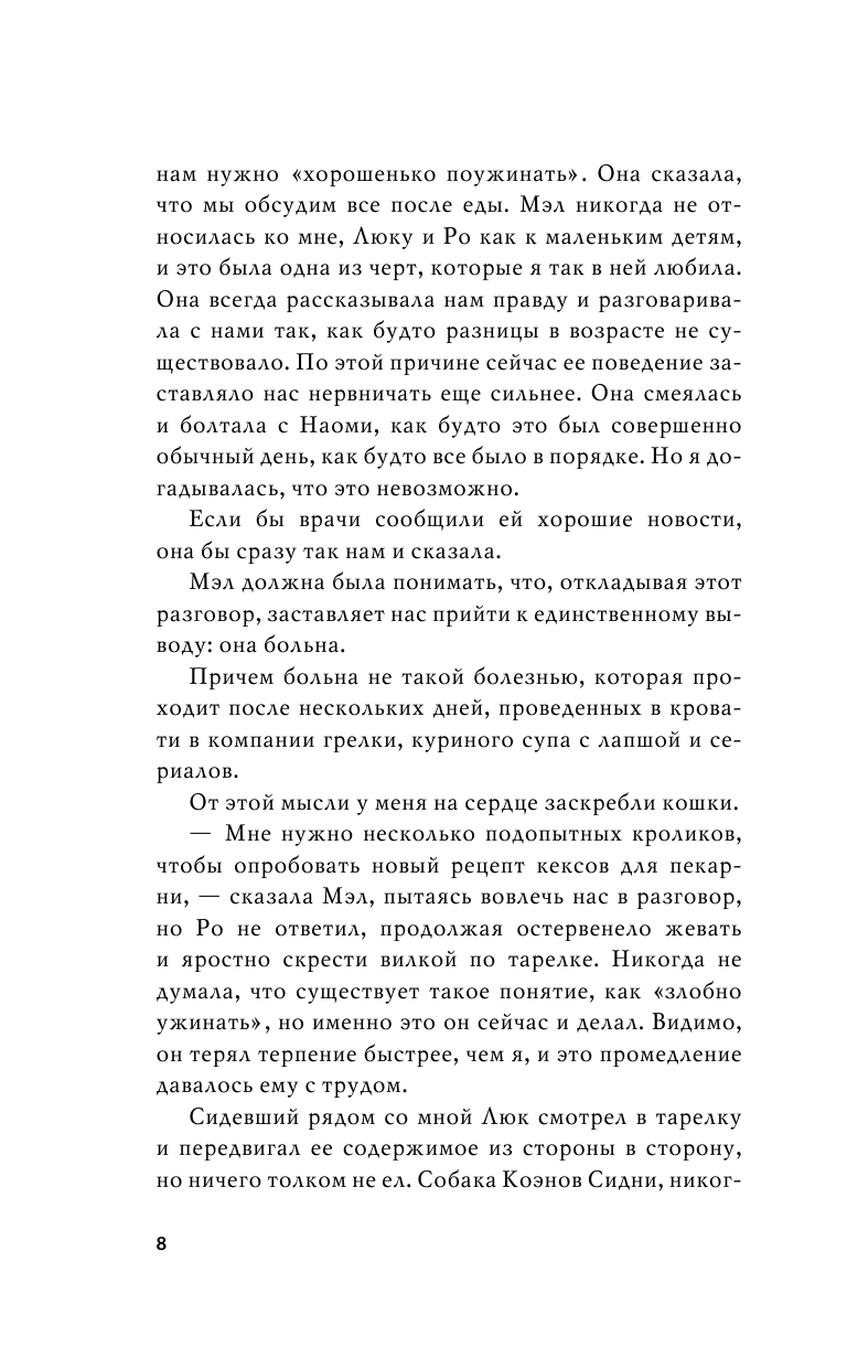 Проглотила книгу за вечер. И теперь не смогла дождаться утра, чтобы написать отзыв. В глазах стояли слезы всю вторую часть книжки. В ней столько боли. Это книжка не для поднятия настроения, хоть и финал близок к хеппи энду. Тут есть и болезнь, и потери, и предательство. В ней есть настоящая жизнь.