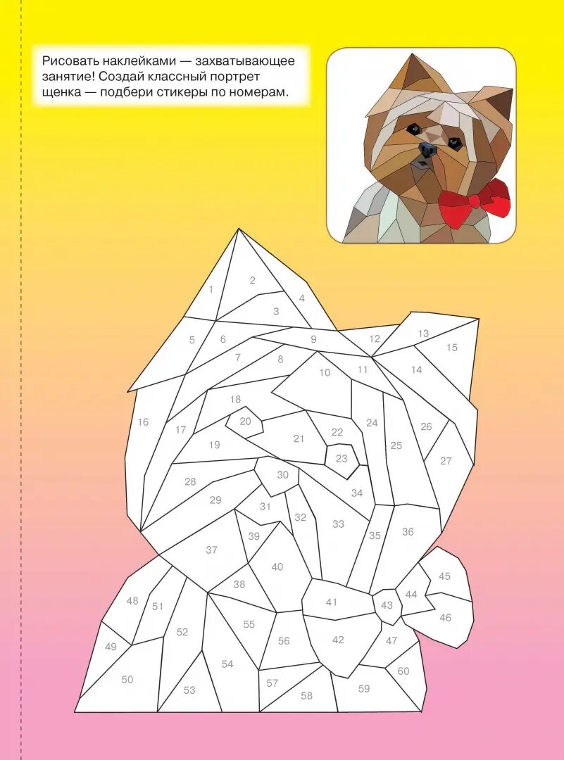 Эта книжка напоминает раскраски по номерам, только здесь нужно не закрасить нужным цветом определенный участок, а вклеить в указанное место наклейку с тем же номером. То есть ребенок должен уже либо знать цифры (числа до 67), либо внимательно соотносить числа на картинке и на листе с наклейками. Работа требует аккуратности: неправильно или криво наклеенный кусочек не переклеить. Фантазии тут разгуляться негде (как и в картинках по номерам). Книжка развивает усидчивость и аккуратность. Результат получается симпатичным, объемным. В целом можно рекомендовать детям с 5 лет.