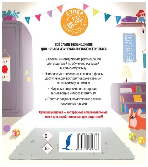 Хорошее пособие для обучению детей 4-6 лет. Сначала идет описание транскрипции и английский алфавит, затем представлены 40 кратких уроков на запоминание важных фраз (здравствуйте, меня зовут, что это и т.п.). На каждой страничке есть рекомендация для родителей насчет подходящей игры для запоминания правил). В конце книги есть стишки и считалочки, а также прописи букв.