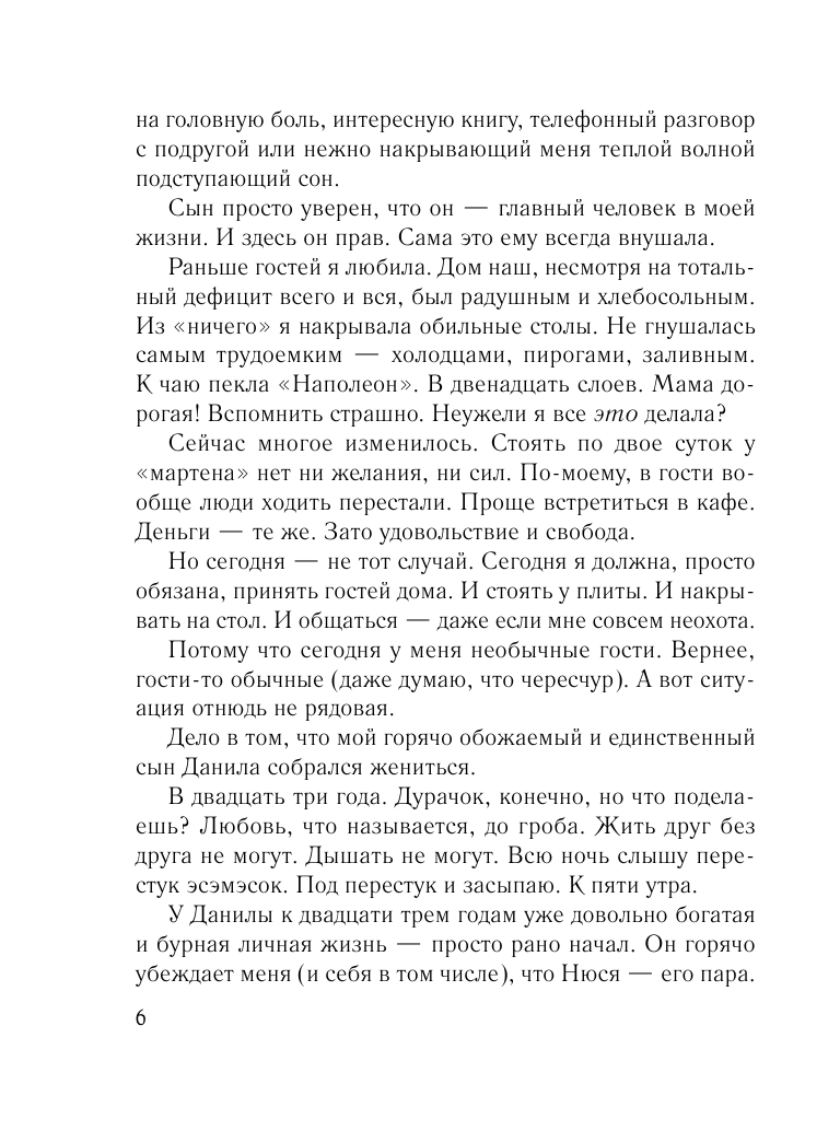 Так вышло, что сначала я посмотрела фильм, а потом уже выяснила, что этот замечательный фильм снят по книге Марии. Тут же приобрела книгу. Несмотря на то, что были еще очень свежи впечатления от просмотренного кинофильма, села пролистать повесть. Очень хотелось сравнить, что лучше. Через полчаса я обо всем на свете забыла. Какая чудесная книга! Сколько в ней юмора, теплоты, света, любви. А самоирония, заложенная в каждом слове свекрови, притягивает еще больше. Автор через призму своего жизненного опыта пытается донести до нас, что в семье и в отношениях можно избежать множества проблем, если слушать и слышать друг друга, если уважать друг друга и хоть иногда ставить себя на место невестки (или свекрови).