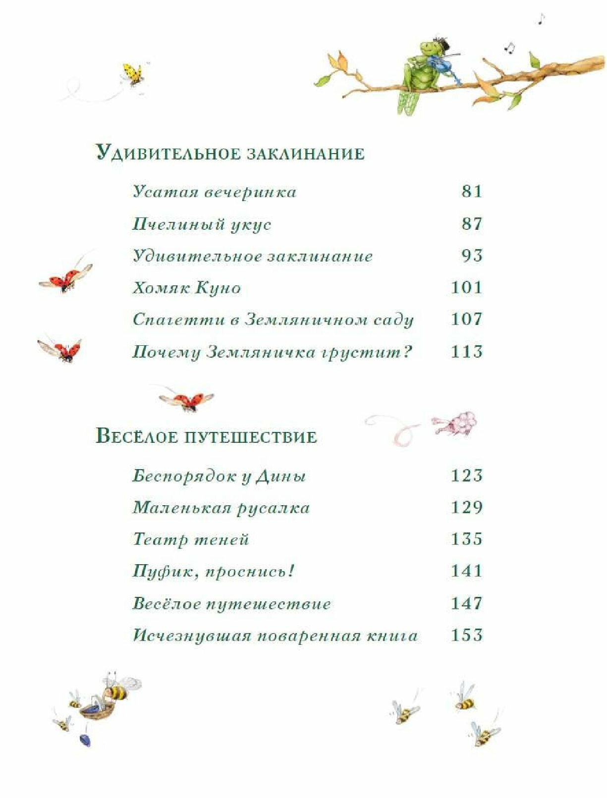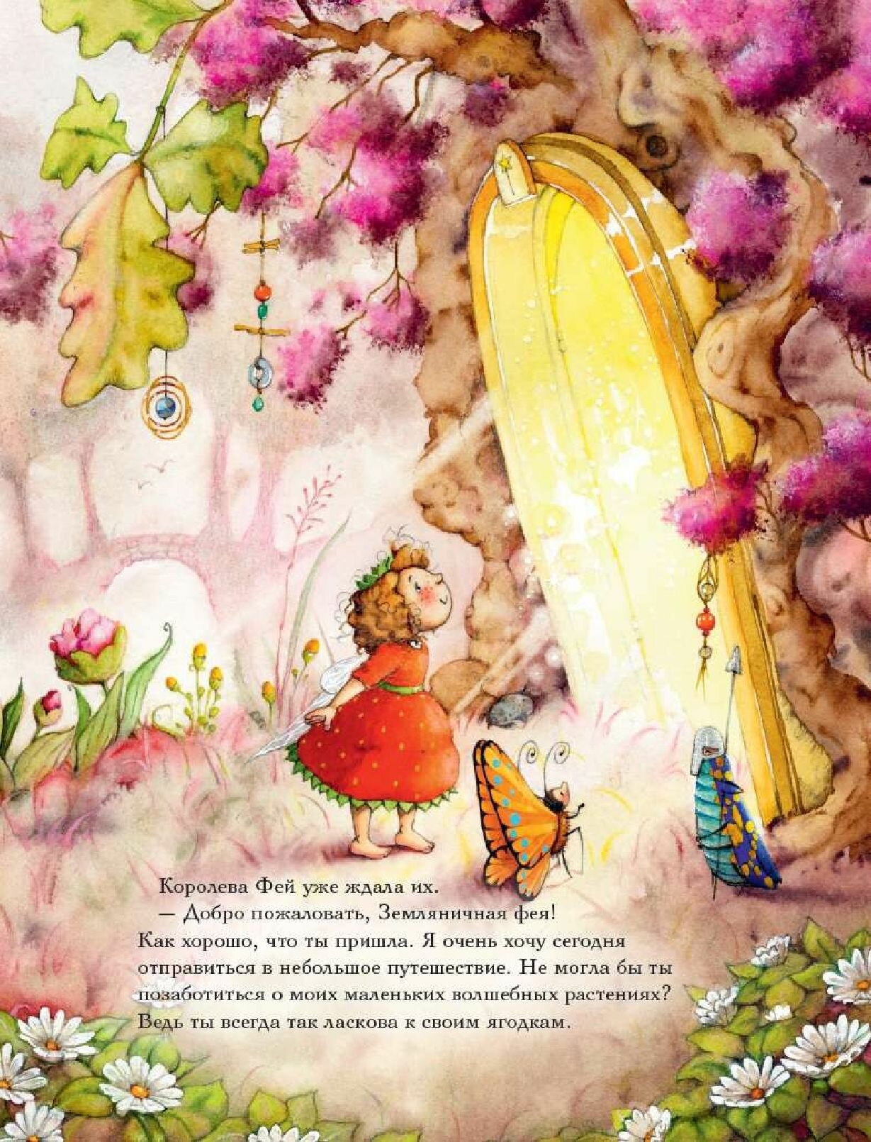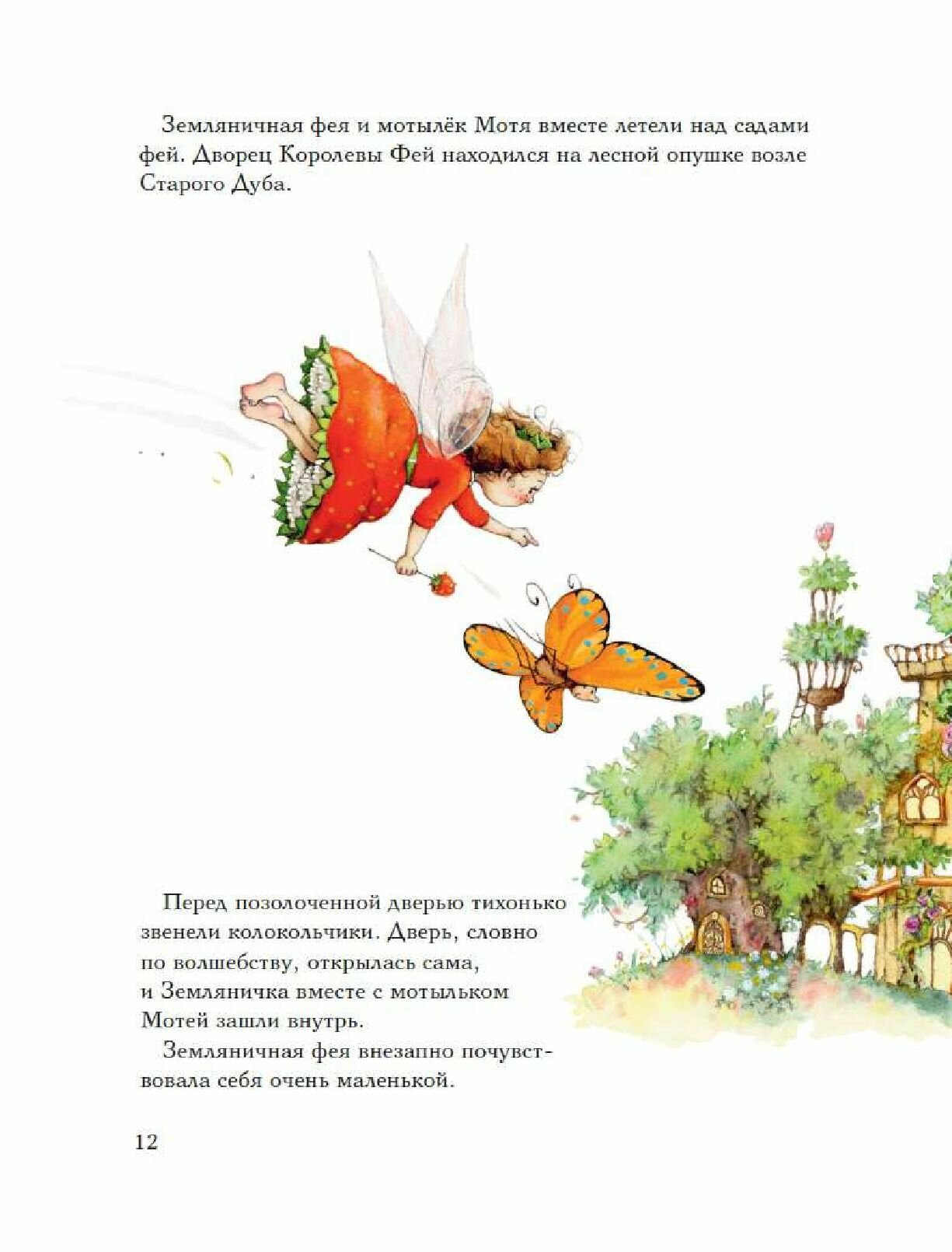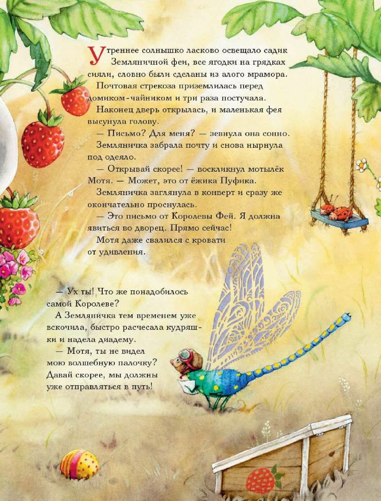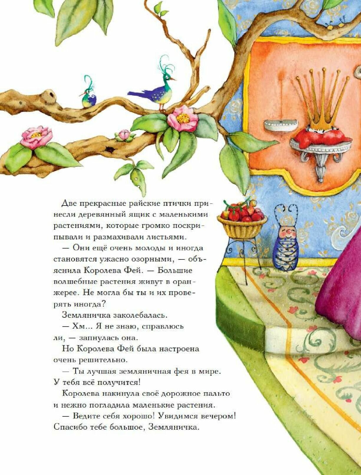 Книжка продуманная, если у вас нет ещё историй про Земляничку, то первая истории - это сказка-картинка, очень много иллюстрации. О том, как Земляничку попросили присмотреть за растеньями королевы. Только представляете, там тоже все волшебное, например, Мотя нанюхался пыльцы фиалок и решил, что он Король. А в этот момент его подруге очень нужна была помощь, потому что дворец заливал дождь)))