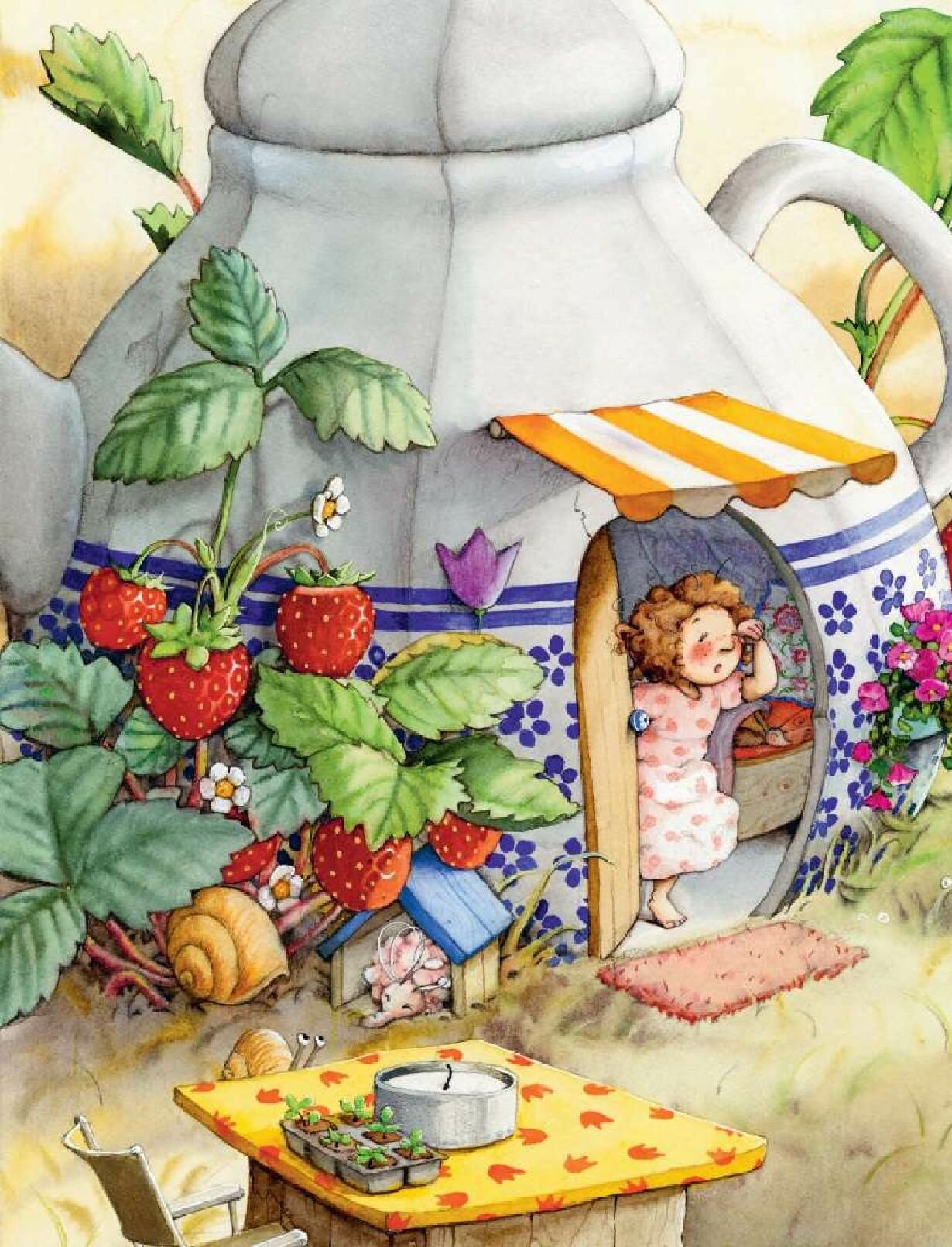 Там ещё очень много отличных историй - земляничка стала привидением, ловя похитителя клубники, и теперь ее любимое блюдо спагетти с соусом из земляники. А вот я году она удобряет - мышиным помётом (сын сразу по картинке спросил - Мама, это какиашка?) Для меня в этом нет ничего страшного, навозом всю жизнь удобряли. Есть повод рассказать ребенку. И ещё много-много историй.