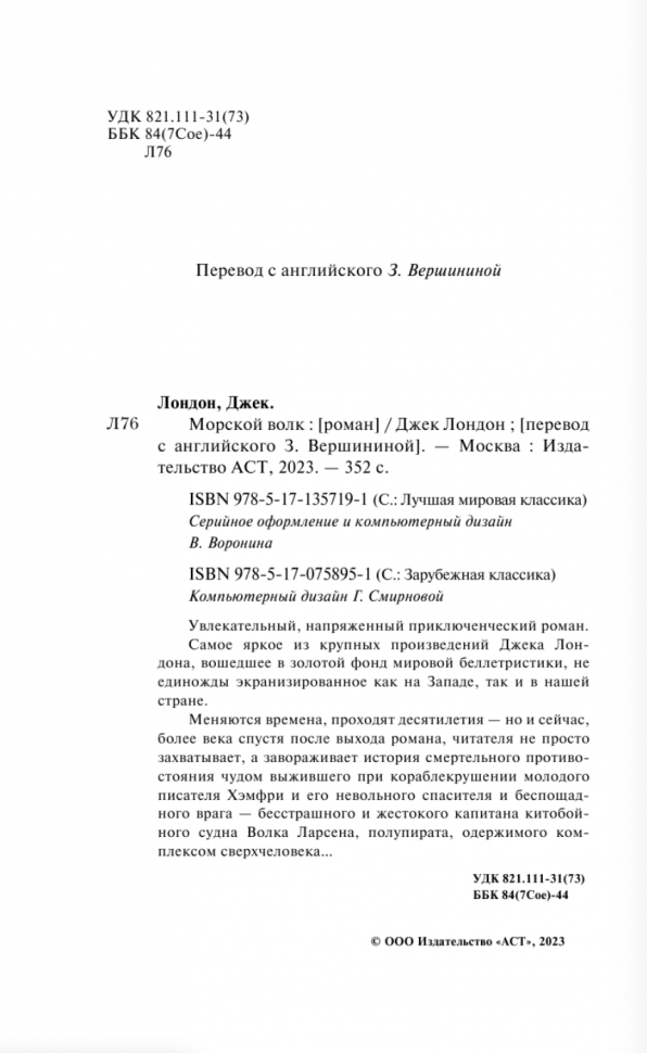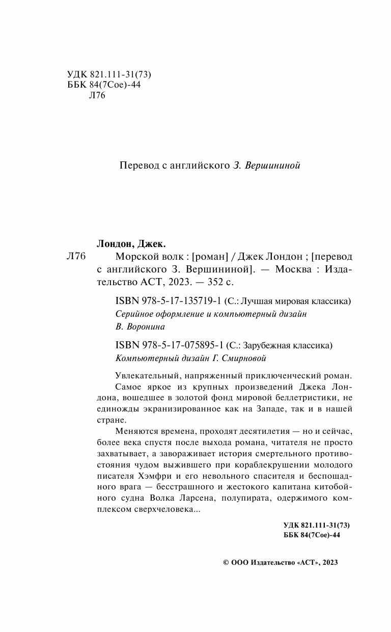 Джек Лондон – американский писатель 19-20 века, пишущий увлекательнейшие произведения и одно из них «Морской волк». Книга стандартного размера и выполнена в приятном на ощупь матовом переплете. Страницы не белоснежные, но достаточно светлые для удобства глаз. Шрифт четкий и комфортный для чтения.