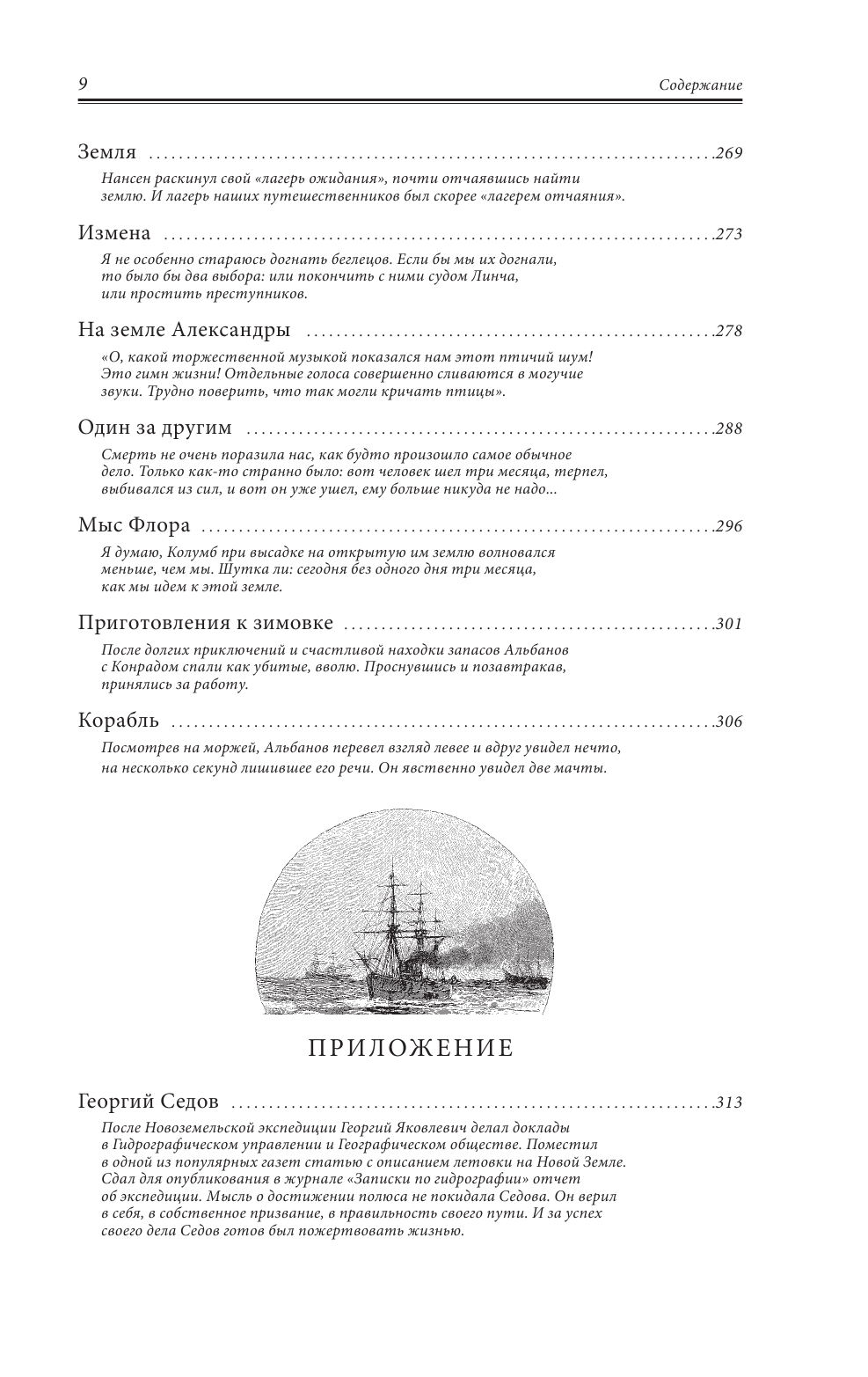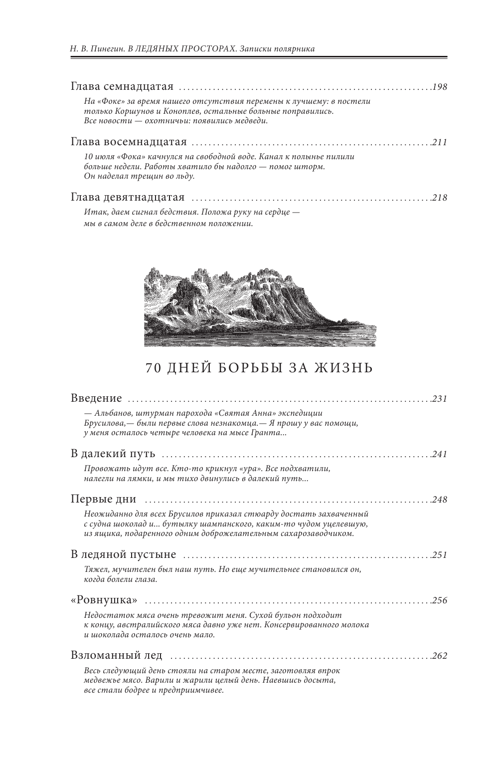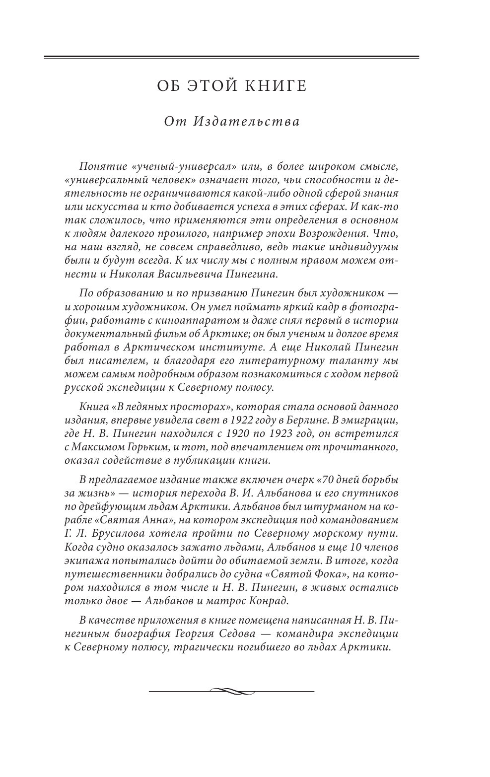Эта книга написана одним из участников первой русской экспедиции к Северному полюсу под командованием Г. Я. Седова, состоявшейся в 1912-1914 гг., - Николаем Васильевичем Пинегиным (1883-1940). Н. В. Пинегин - художник, писатель, ученый. Благодаря его литературному таланту мы можем самым подробным образом познакомиться с ходом этого героического и трагического похода. В книге также представлены фотографии, сделанные Н. В. Пинегиным непосредственно во время путешествия в полярные широты. В издание также включен очерк "70 дней борьбы за жизнь" - история перехода В. И. Альбанова и его спутников по дрейфующим льдам Арктики. Альбанов был штурманом на корабле "Святая Анна", на котором экспедиция под командованием Г. Л. Брусилова хотела пройти по Северному морскому пути. Когда судно оказалось зажато льдами, Альбанов и еще 10 членов экипажа попытались дойти до обитаемой земли. В итоге, когда путешественники добрались до судна "Святой Фока", на котором находился в том числе и Н. В. Пинегин, в живых остались только двое - Альбанов и матрос Конрад. В качестве приложения в книге помещена написанная Н. В. Пинегиным биография Георгия Седова - командира экспедиции к Северному полюсу, трагически погибшего во льдах Арктики.