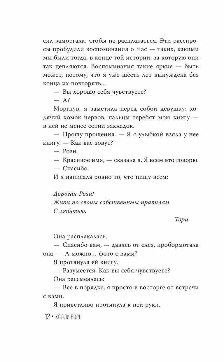 С творчеством Холли Борн я был уже знаком раньше. Ее манера письма и необычный слог настолько сильно увлекли меня, что оторваться от истории было очень тяжело. Главная героиня понимает, что в ее жизни не все настолько отлично, как она думала. Весь сюжет, по большей степени, вертится вокруг героини. Борн показывает, как Тори пытается решить все те проблемы, которые ее окружают. Книга смогла меня заинтересовать, а также из неё можно почерпнуть много полезного.