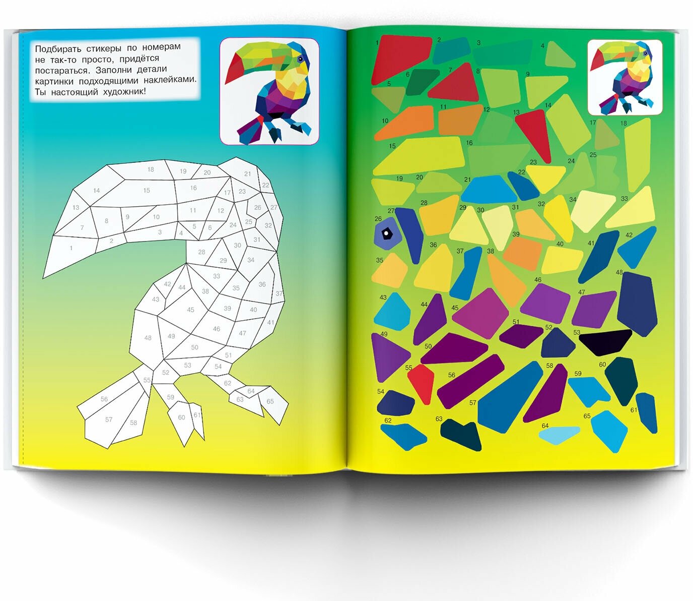 Замечательное развлечение для детей! Дочки (5 и 8 лет) в восторге! Младшая вполне самостоятельно рассматривает цифры и клеит наклейки, хотя до этого с числами не занималась (только устный счёт). Сразу несколько удовольствий в одном: пазл, наклейки и яркие картины. Бумага плотная. Но картины отличаются от тех, что на обложке (нет енота, верблюда, зато есть тигр).