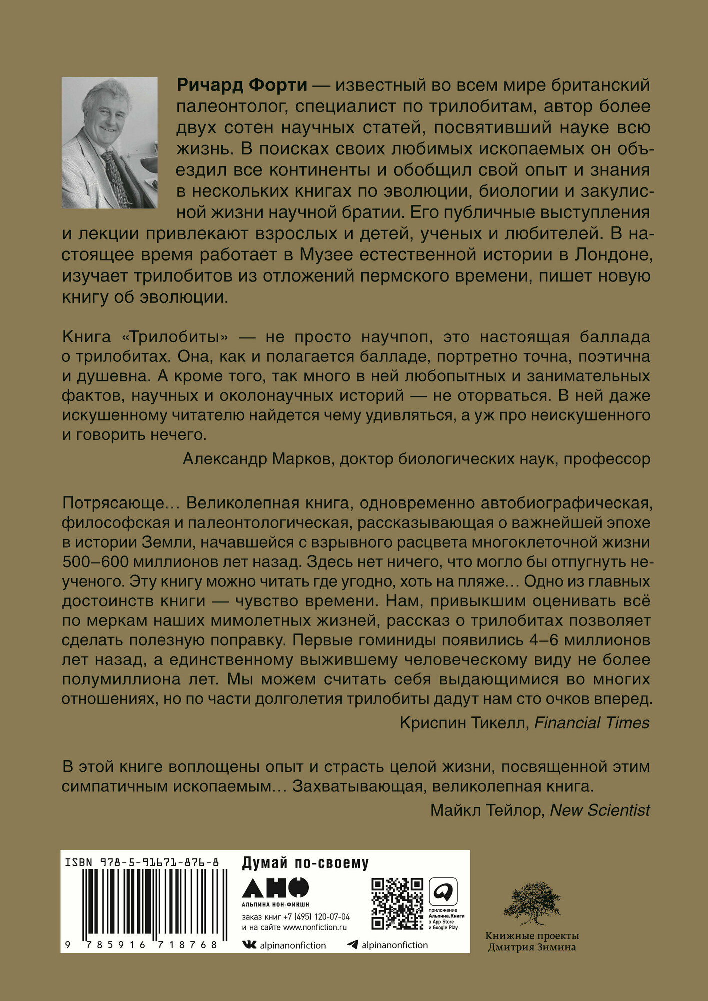 Насколько я знаю, это первая популярная книга на русском языке о трилобитах. Это не сухое научное повествование об исчезнувших с лица Земли организмах, а также рассуждения о жизни, рассказы о коллегах по увлечению и о поисках окаменелостей. Для меня книга интересна потому, что у меня самой есть небольшая коллекция трилобитов!