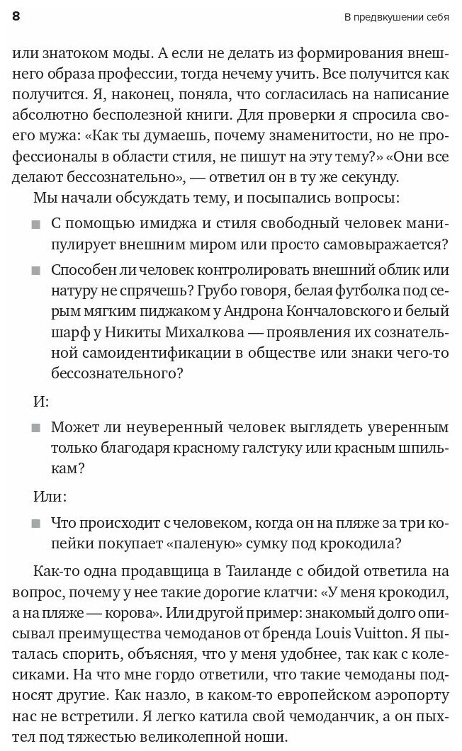 Автор не просто раскрывает свое видение стиля, она рассказывает о своей философии жизни. Ведь одежда, прическа, обувь, аксессуары — это средство самовыражения, обеспечивающее единство тела и сознания, а значит, профессиональный успех.