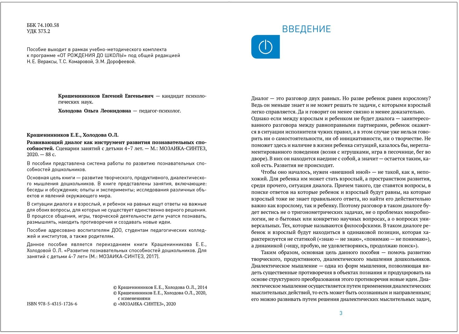 Развивающий диалог как инструмент развития познавательных способностей. 4–7 лет. Сценарии занятий. (Крашенинников Евгений Евгениевич; Холодова Ольга Леонидовна); Мозаика-Синтез, 2021