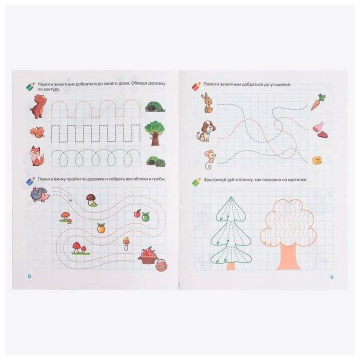 Нужно обводить по контору овощи, помочь животным добраться до своего дома, до угощения. Есть задания на штриховку. В книге 24 листа не скажу, что она прям маленькая. Задания разнообразные. Ребёнка книга заинтересовала. Рекомендую к покупке!