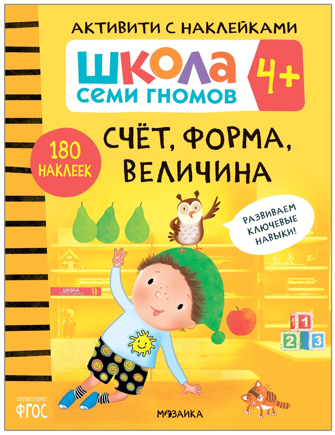 Книга «Счет, форма, величина 4+» из серии «Школа Семи Гномов. Активити с наклейками» предназначена для формирования и развития у детей от 4 до 5 лет элементарных математических представлений, способности измерять величину предметов, определять их форму.