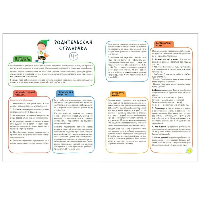 Вместе с гномиком Лучиком ребенок проработает ключевые навыки, решая разнообразные речевые и грамматические задачки. Задания расположены по мере усложнения, что делает процесс обучения еще более полезным и доступным для ребенка. Большое количество наклеек в этой книге не даст ребенку потерять интерес к занятиям, а главное, он обязательно получит удовольствие от учебного процесса.