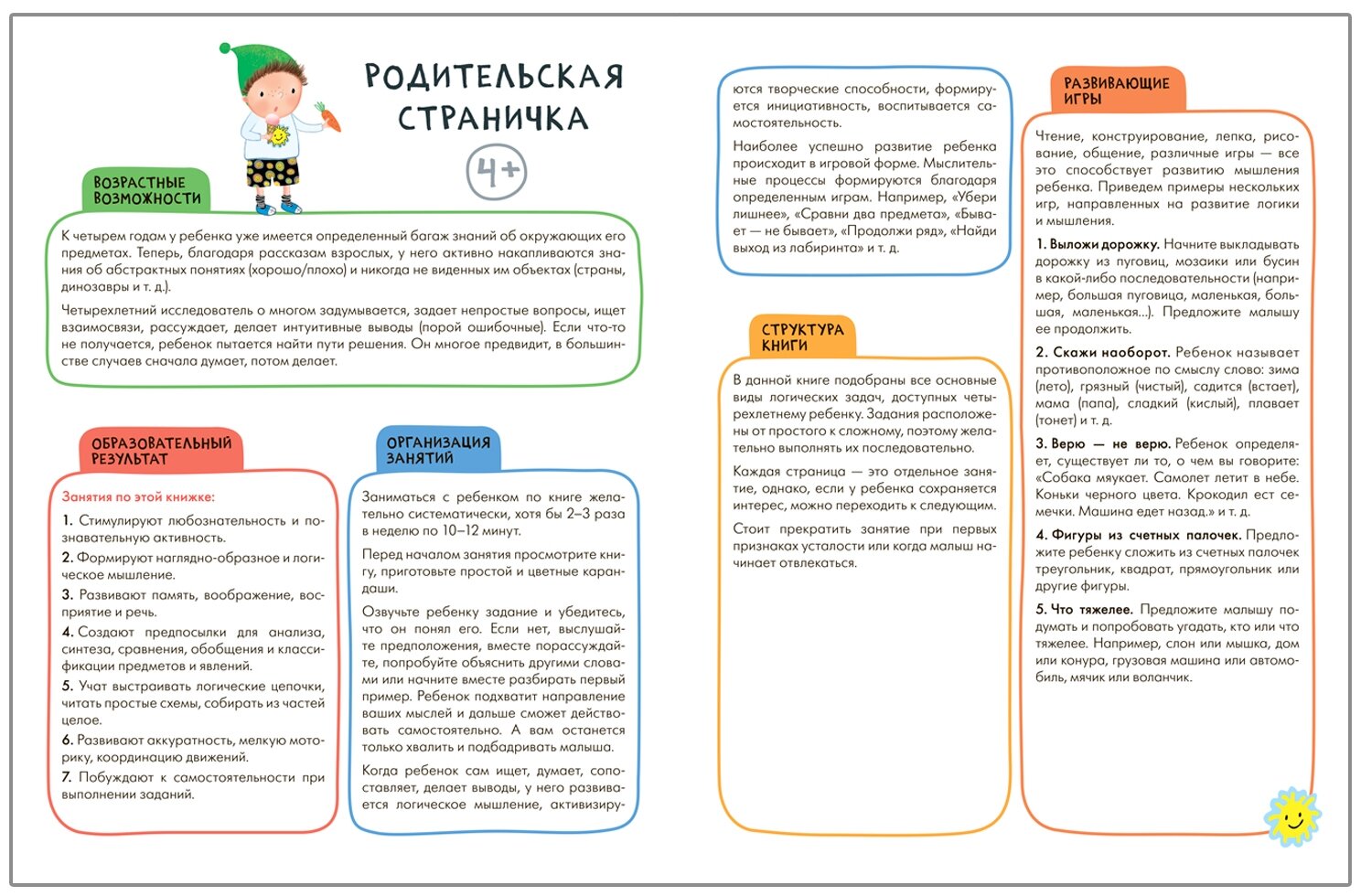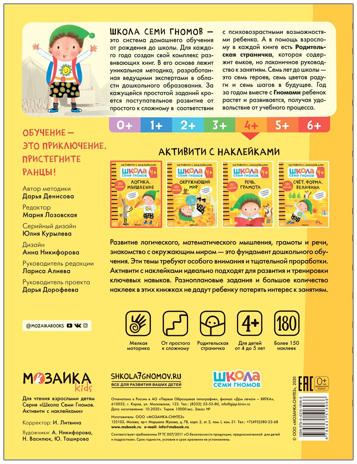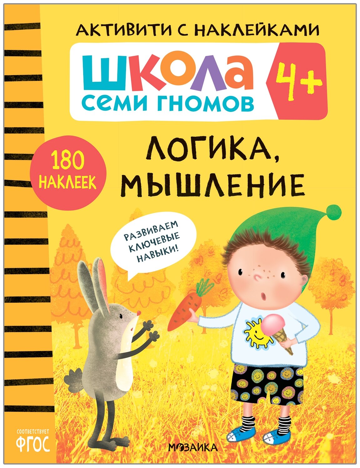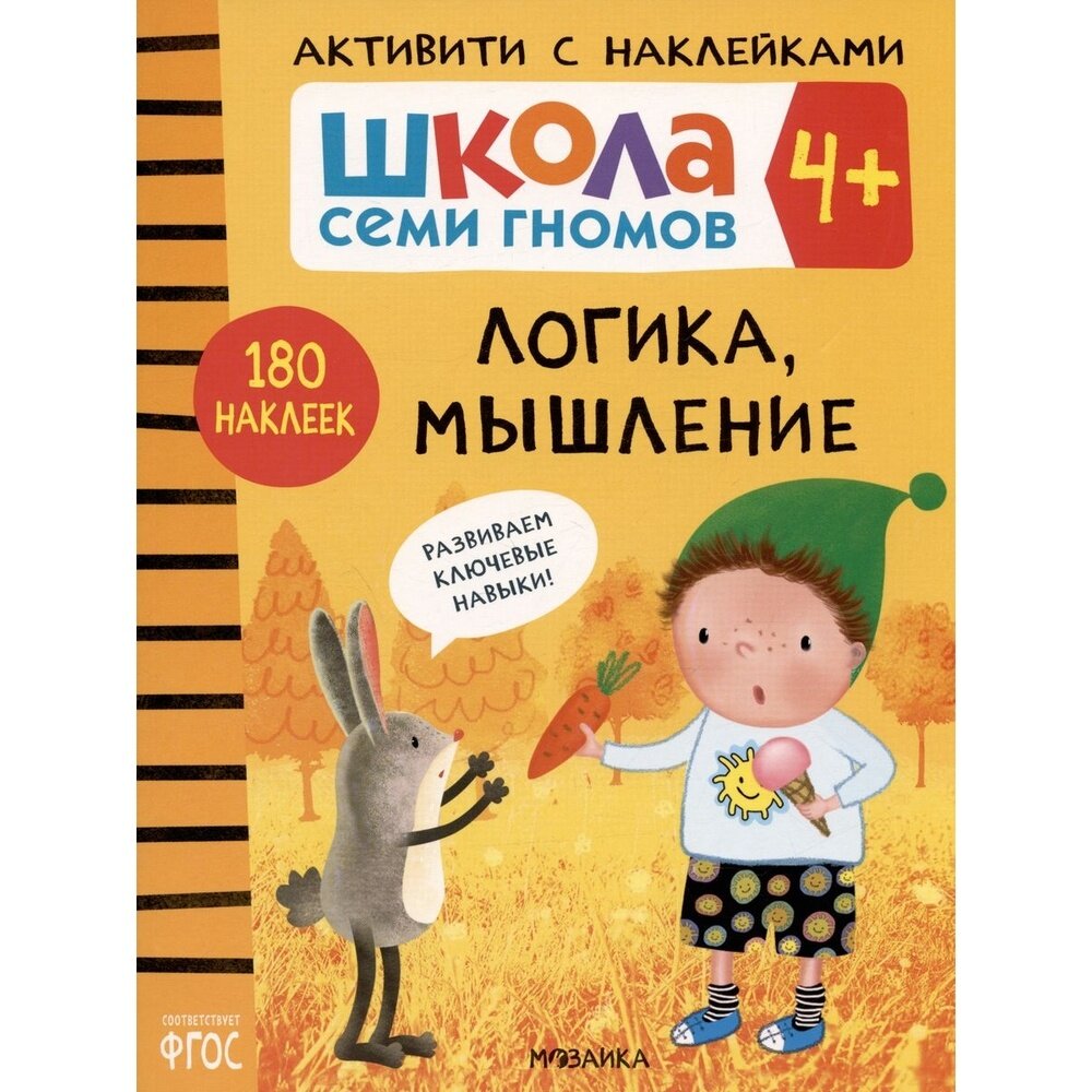 Книга «Логика, мышление 4+» из серии «Школа Семи Гномов. Активити с наклейками» предназначена для развития и тренировки логического мышления детей от 4 до 5 лет.