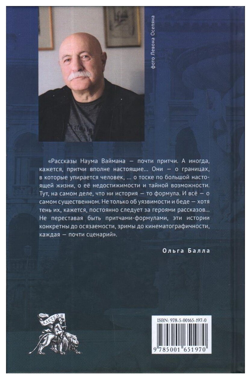 Наум Вайман, известный писатель, автор дневниковой эпопеи "Ханаанские хроники", а также глубокий и неожиданный в своих выводах исследователь творчества Мандельштама ("Черное солнце Мандельштама", "Преображения Мандельштама" и другие книги), поэт, переводчик, публицист, на этот раз предстает в новой ипостаси — как автор рассказов. По словам очень известного и авторитетного в российской литературе критика Ольги Балла "Рассказы Наума Ваймана — почти притчи. А иногда, кажется, притчи вполне настоящие... Они — о границах, в которые упирается человек... о тоске по большой настоящей жизни, о ее недостижимости и тайной возможности. Тут, на самом деле, что ни история — то формула. И все — о самом существенном. Не только об уязвимости и беде — хотя тень их, кажется, постоянно следует за героями рассказов... Не переставая быть притчами-формулами, эти истории конкретны до осязаемости, зримы до кинематографичности, каждая — почти сценарий".