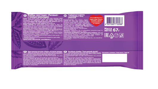 Описание товара:Хрустящие воздушные рисовые хлебцы, глазированные горьким шоколадомСостав товара:Тёмный шоколад (сахар, какао тертое, масло какао, эмульгатор: соевый лецитин, натуральный ароматизатор: ваниль), крупа рисовая шлифованная (рис круглозерный), соль йодированная. Продукт может содержать следы молочных продуктов. Не содержит ГМО.Меры предосторожности:Хранить при относительной влажности воздуха не более 75%, без попадания прямых солнечных лучей. Вскрытую упаковку рекомендуем хранить плотно закрытой в сухом месте. ГОСТ 31721-2012 ТУ 9118-006-53822073-08.