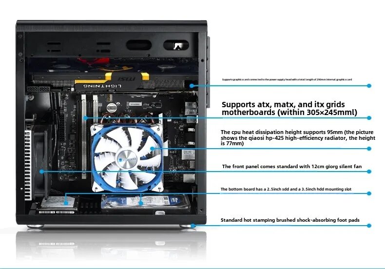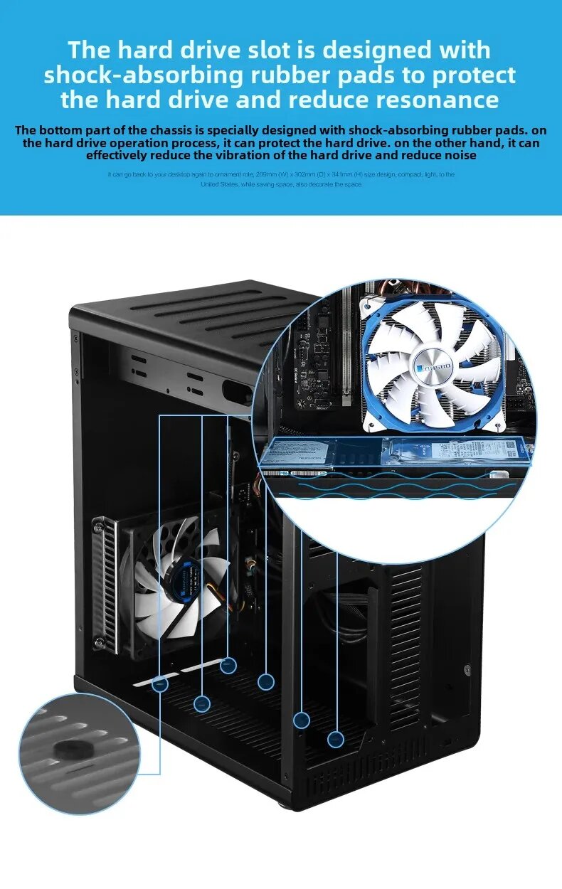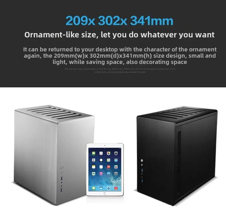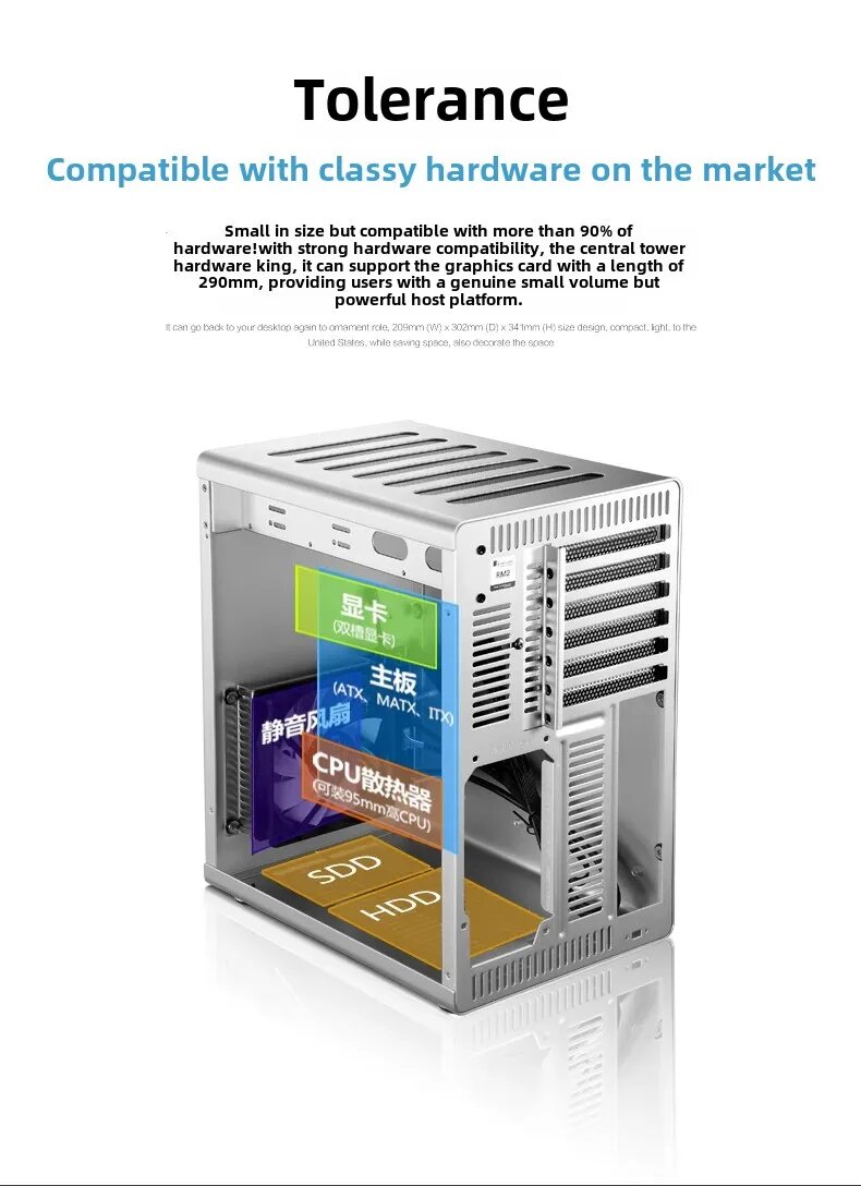 Корпус выполнен в компактном формате Mini-Tower, но при этом предлагает совместимость с материнскими платами формата ATX/microATX/ITX (305 х 245 мм), а также стандартными блоками питания типоразмера ATX PS2.