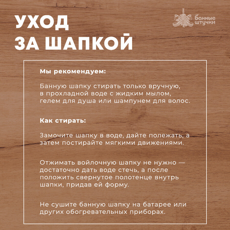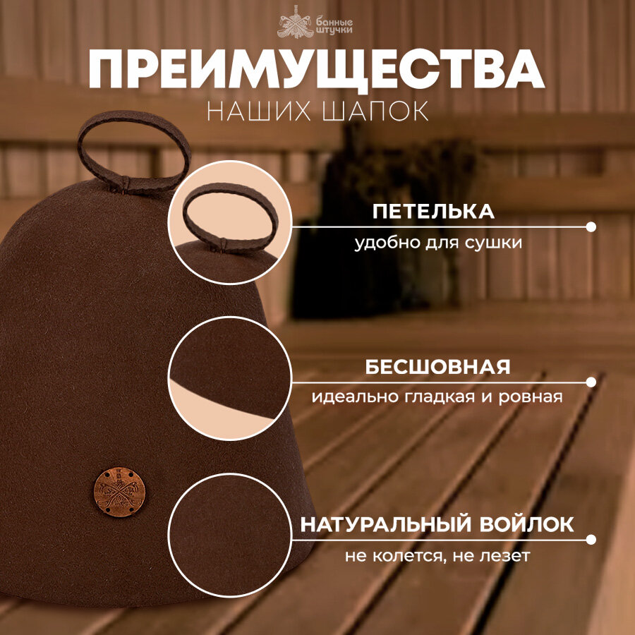 Шапка необходима при посещении парной во избежание перегрева организма, который может вызвать серьезные негативные последствия для здоровья. Благодаря хорошим теплоизоляционным свойствам этого материала внутри головного убора сохраняется комфортная температура. Колпак также защищает волосы от поражения горячим воздухом, который делает их ломкими. Материал быстро принимает и испаряет влагу с кожи, что способствует более комфортной банной процедуре. Петелька на макушке облегчает просушивание и хранение аксессуара.