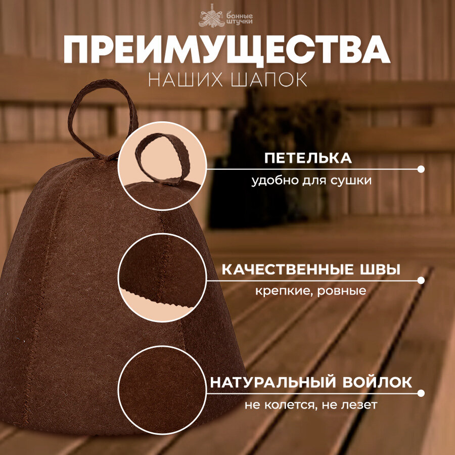 Шапка необходима при посещении парной во избежание перегрева организма, который может вызвать серьезные негативные последствия для здоровья. Благодаря хорошим теплоизоляционным свойствам этого материала внутри головного убора сохраняется комфортная температура. Колпак также защищает волосы от поражения горячим воздухом, который делает их ломкими. Материал быстро принимает и испаряет влагу с кожи, что способствует более комфортной банной процедуре. Петелька на макушке облегчает просушивание и хранение аксессуара.