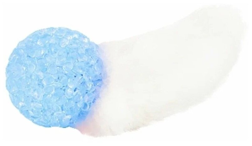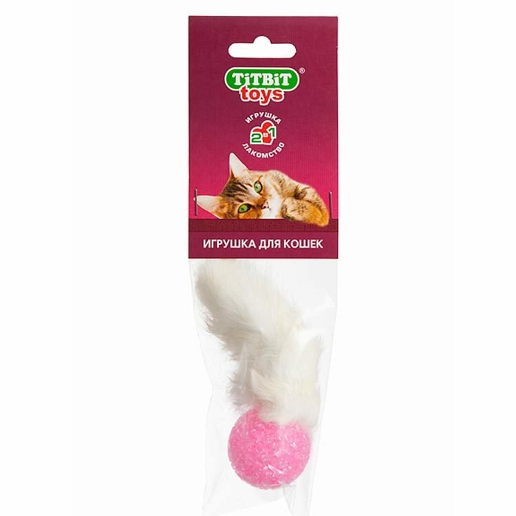 Привлекательная натуральная игрушка-лакомство для кошек - высушенный кроличий хвост в шерсти, прикреплённый к пластиковому мячику с бубенчиком.