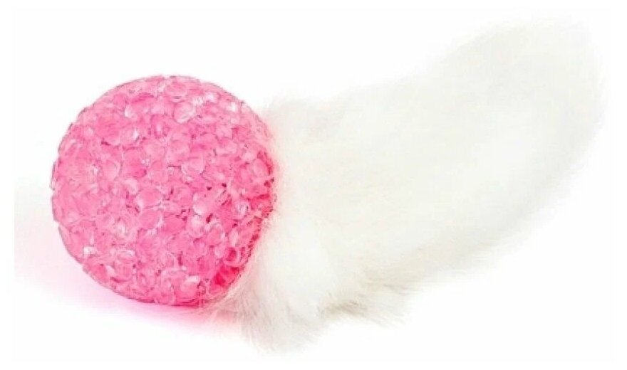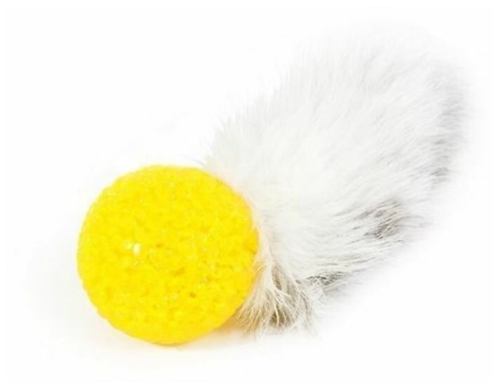 Привлекательная натуральная игрушка для кошек - высушенный кроличий хвост в шерсти, прикреплённый к пластиковому мячику с бубенчиком.
